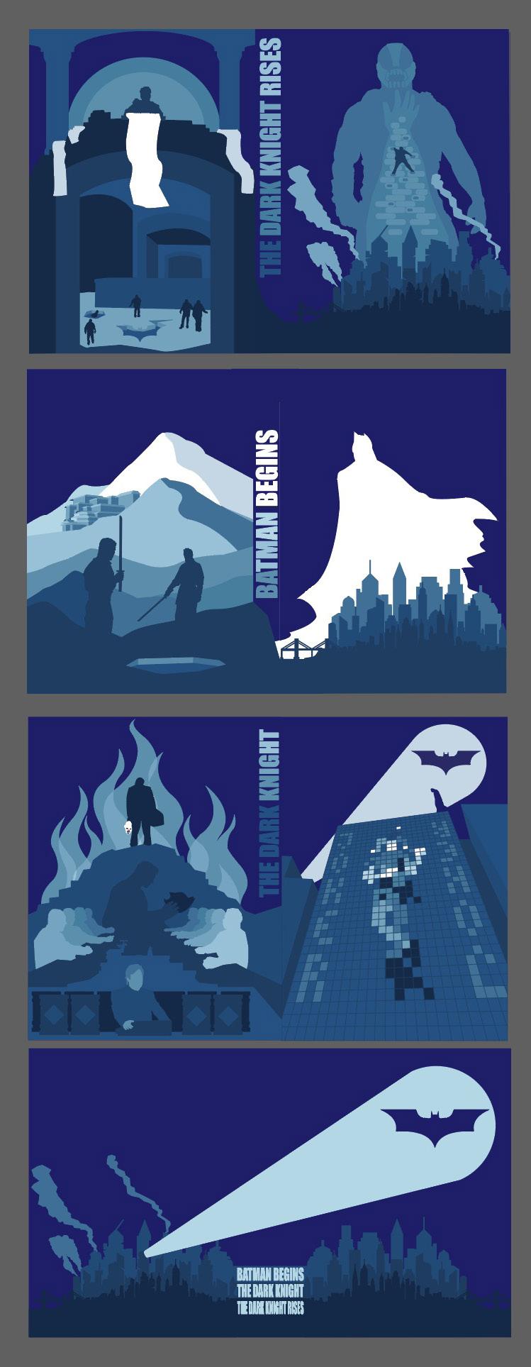 Oppgaven min er et minimalistisk redesign av Christopher Nolans Batman-trilogi. Jeg jobber med en begrenset blåtone fargepalett. De forskjellige designene mine skal brukes som dvd kover og en dvd boks til trilogien.