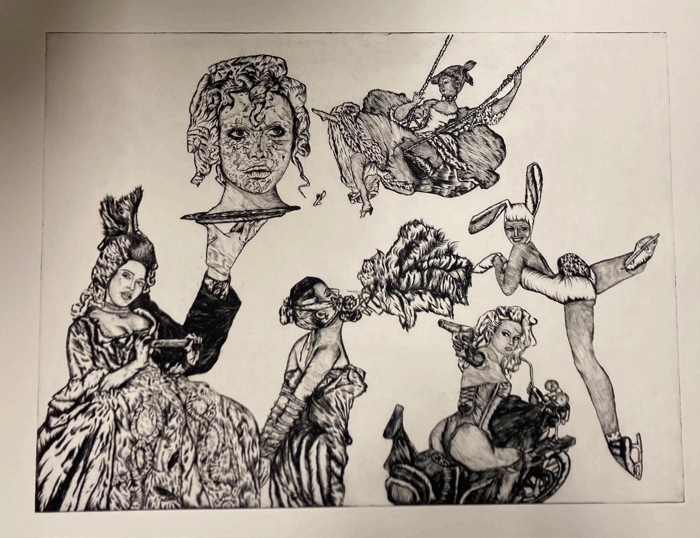 I den praktiske oppgaven har jeg jobbet med koldnålsteknikk. Jeg har laget en collage som skal representere kvinnelig skjønnhetsidealer.