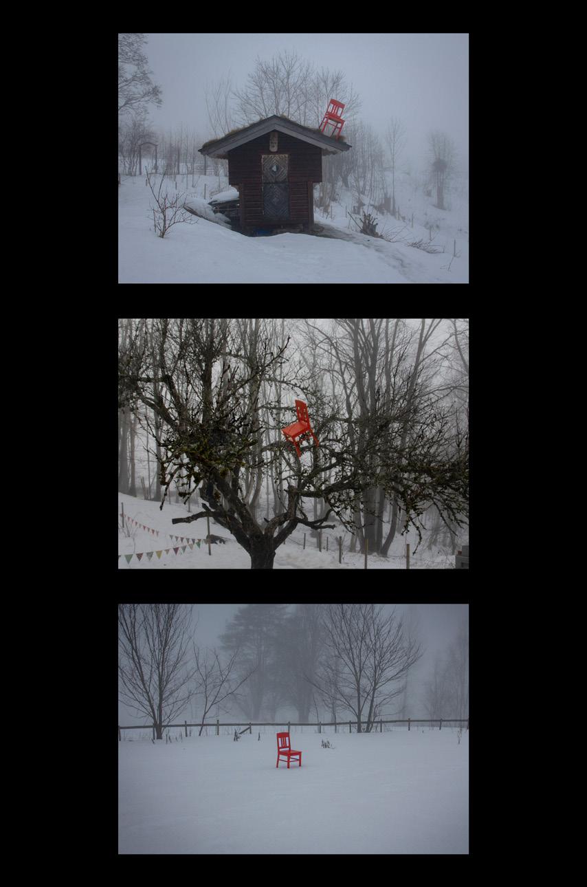 Fordypningsoppgaven min er en bildeserie på syv bilder. Jeg har utforsket ideen om å plassere en rød stol på uventede steder for å utfordre publikums forventninger og skape visuell interesse. Jeg har jobbet med naturlig lys ute i, iscenesatte motiver, kontraster og linjer.