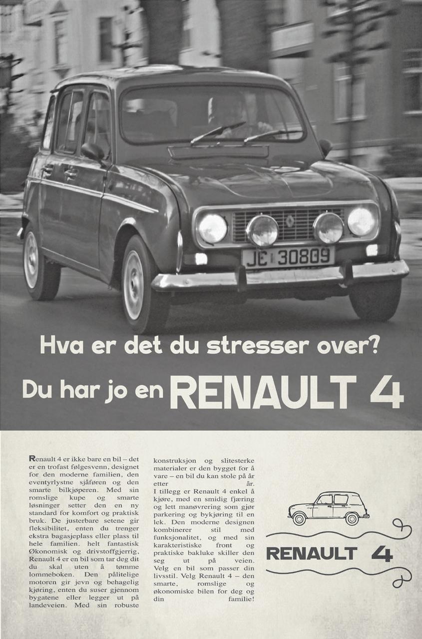 For min fordypningsoppgave har jeg valgt å lage en bilreklame for bilen Renault 4, som om den er laget i 1960. Dette er en gøy bilreklame, som handler om en travel musiker som heter Louis som får en viktig tidskrevende telefonsamtale, at han må spille på en konsert innen 5 minutter! Noe Louis tydeligvis ikke har tid til, eller har han det? Ved hjelp av renault 4 rekker du hva som helst!