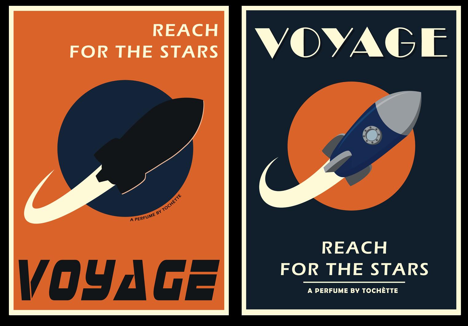 Jeg har designet og 3D-printet en fiktiv parfyme kalt «Voyage», samt laget to reklameplakater.