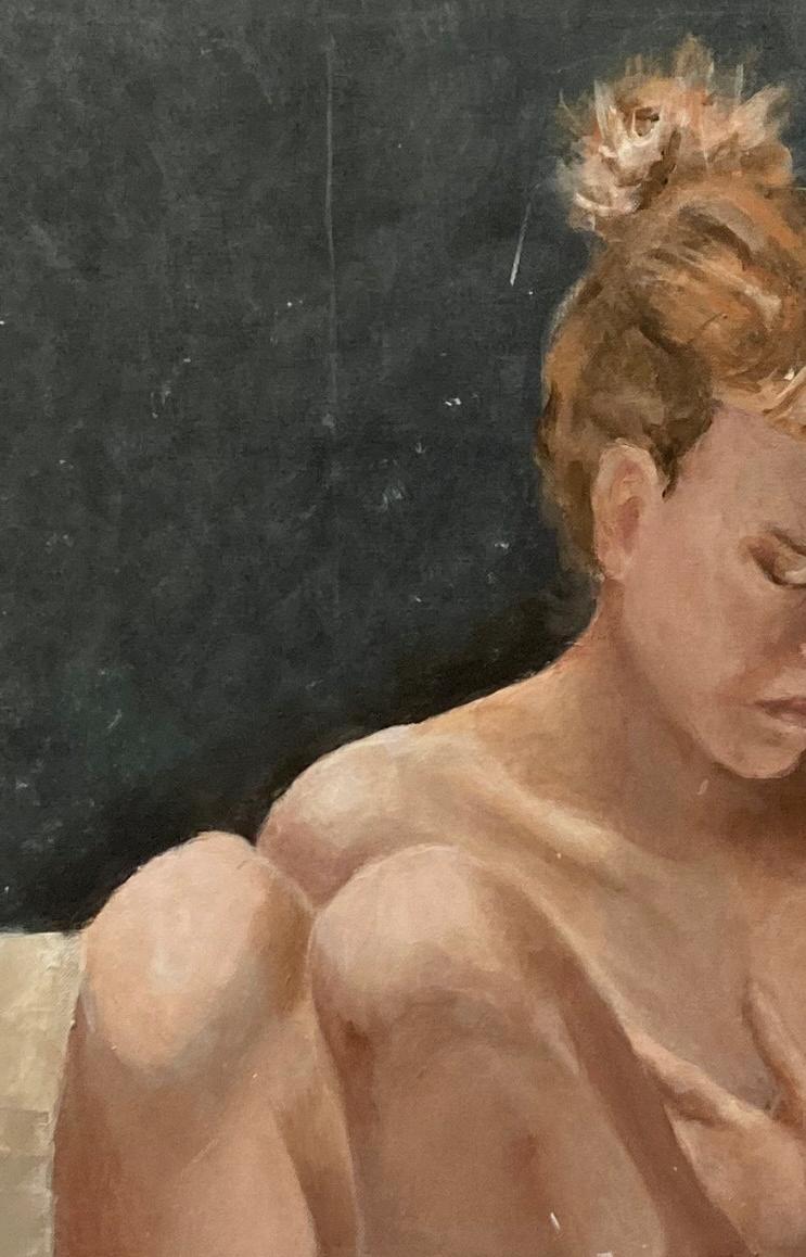 Gjennom historien har kvinner til stadighet blitt objektivisert. Mye kunst skapt av menn er mindre en representasjon av hvem som portretteres og mer et erotisk bilde ment for det mannlige syn. I nåtiden er kanskje ikke kunst like sentralt som før, men kvinners skjønnhet blir fortsatt brukt for å promotere produkter i reklame eller brukt som en fin «ting» å se på. Før i tiden var det hovedsakelig menn som hadde råd til å kjøpe kunst og den ble dermed tilpasset kjøperens øye. Fortsatt brukes kvinnen og hennes kropp og utseende for å selge produkter. Jeg ønsker i denne oppgaven å belyse hvordan historien har normalisert og redusert kvinnen til objekter. Jeg vil også drøfte nakenhet i kunst og gå inn i forskjellen mellom «nakenhet» og«nude». Målet med maleriet mitt er å lyssette hvor normalisert det har blitt å se på nakne kvinner, spesielt i kunsten. Jeg håper at tilskueren vil se på bilde og få en følelse av at de invaderer kvinnens personlige intimsone.