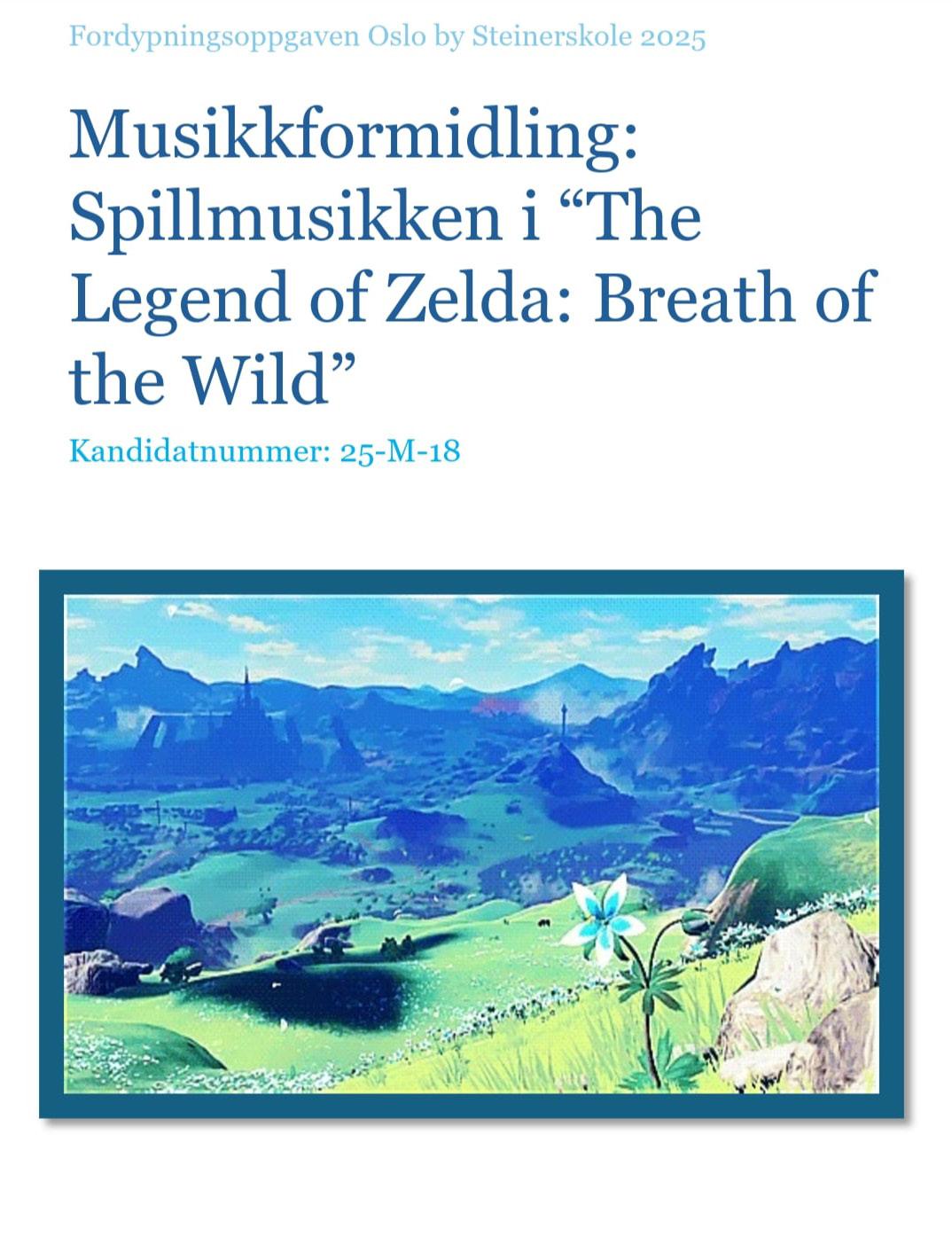 Oppgaven min er en analyse av musikken til spillet The Legend of Zelda: Breath of the Wild og forholdet den har til den narrative og den visuelle informasjonen spillet gir deg. For å utforske dette ser jeg på spillets musikalske virkemidler, hovedsakelig instrumentering og ledemotiv.