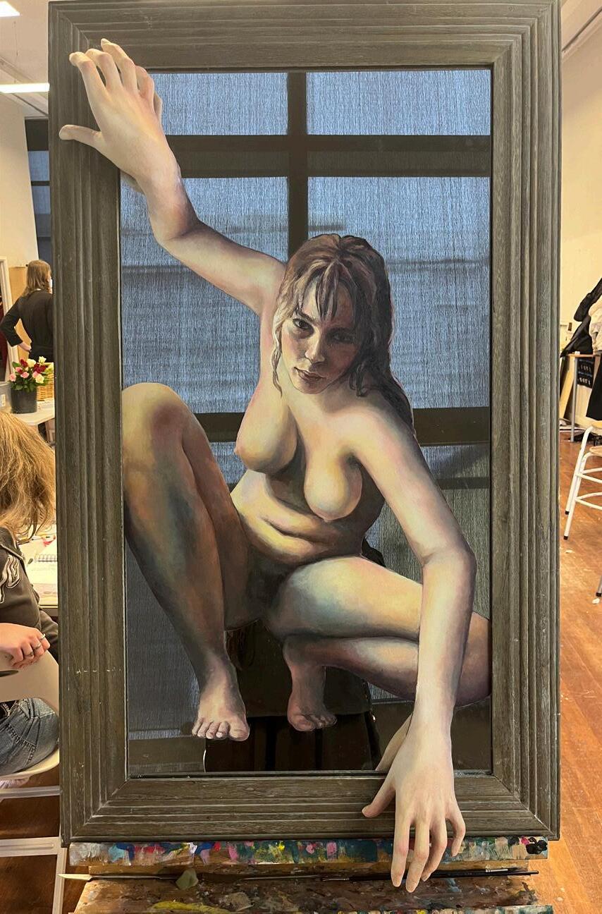 Jeg har laget et maleri oljemaleri på speil. I den teoretiske oppgaven skrev jeg om hvordan kvinner blir fremstilt av menn, samt hvordan kvinner fremstiller seg selv og hverandre. Kvinners verdi vurderes ofte ut fra deres utseende og seksualitet. Jeg ønsker å uttrykke hvordan kvinner ofte er fanget i sin egen refleksjon og bruker mye tid på sitt utseende. Derfor vil jeg illustrere det å bryte ut av denne fleksjonen, samtidig som jeg fremstiller meg selv på en naturlig måte – fri fra skjønnhetsidealer og samfunnets press på kvinnekroppen.