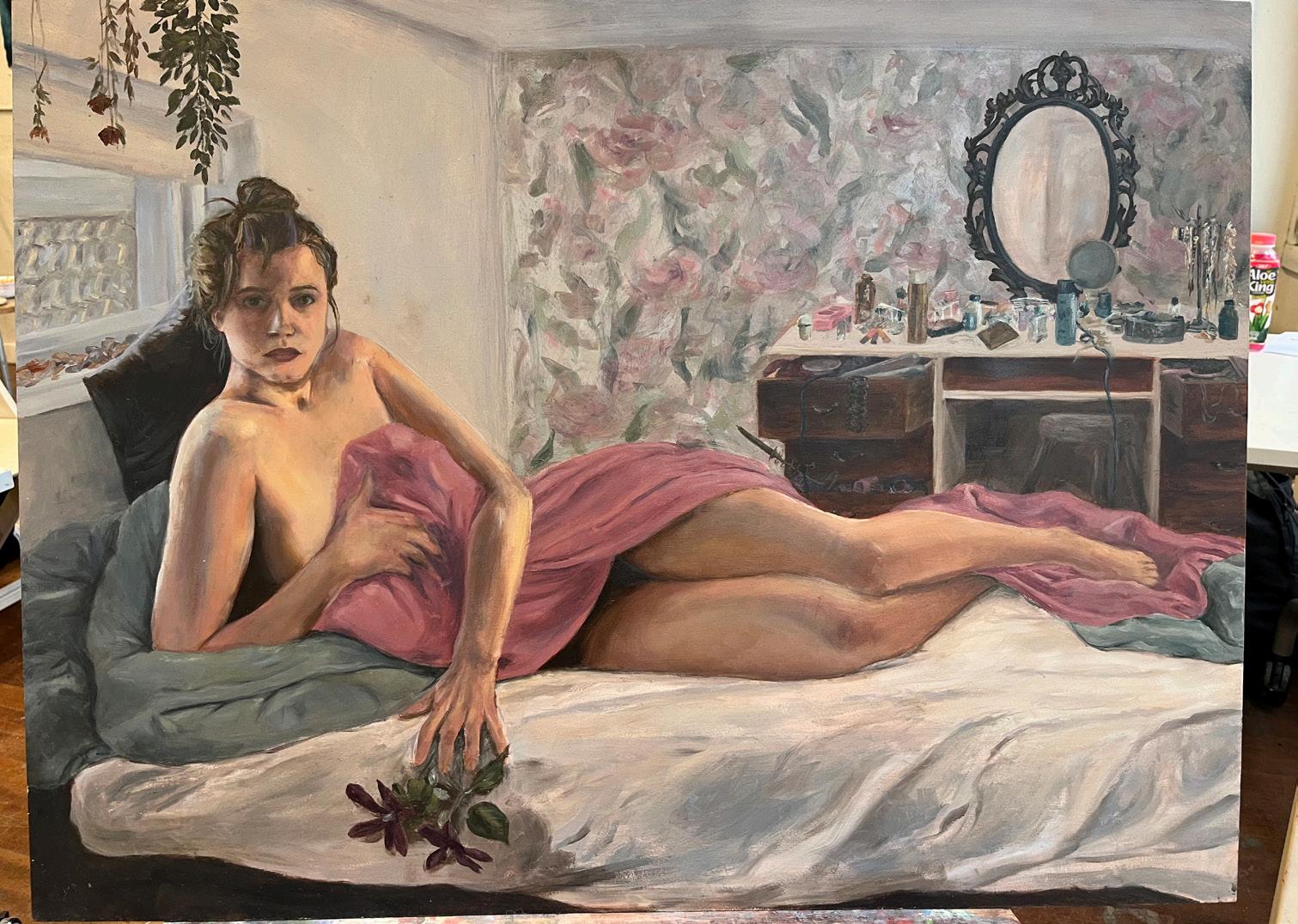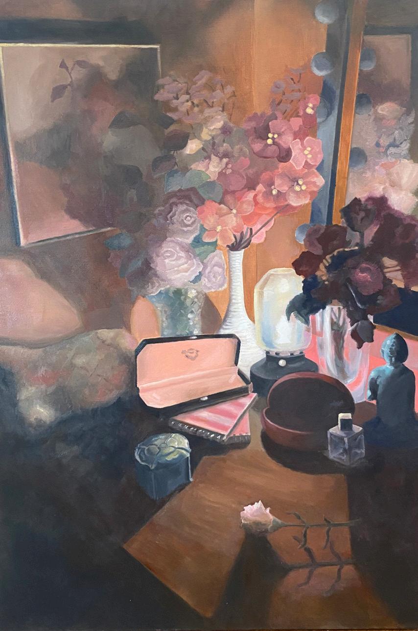 Jeg har jobbet med å lage et oljemaleri på format 120cm× 80cm. Jeg har jobbet rundt «Symbolikk i maleri» med et stilleben fra rommet mitt. Inspirert av barokkstil med både realistisk og malerisk uttrykk.