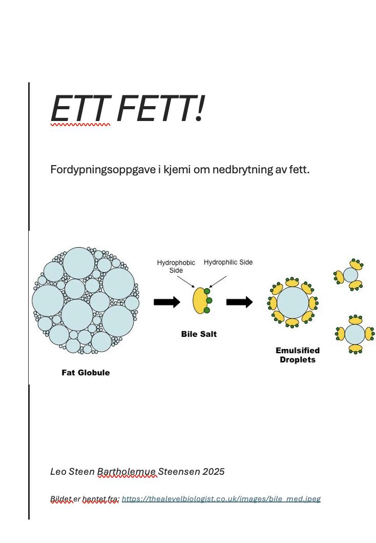 Oppgaven min er en kjemirapport, og handler om fordøyelsen, spesifikt om fordøyelse av fett. jeg har skrevet om lipase og gallesalt, hvilket er det som bryter ned fett i kroppen, hvor bra det funker, og hvordan det funker.