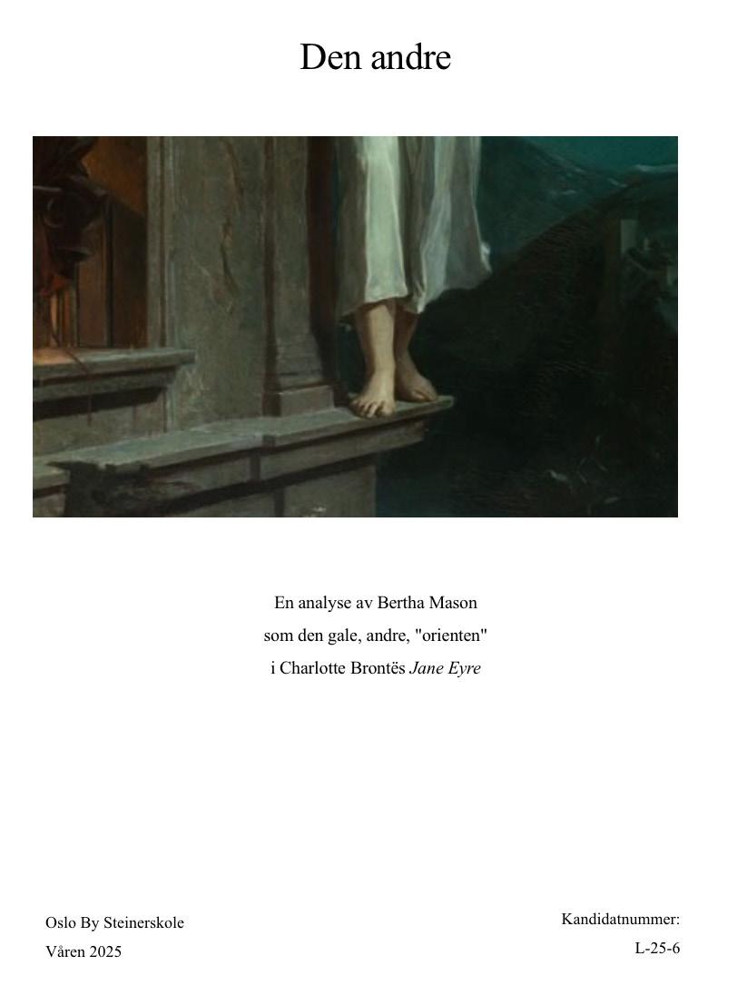 I min fordypningsoppgave skriver jeg om kvinnelig galskap ved bruk av karakteren Bertha Mason fra Jane Eyre. Jeg utforsket hvordan Bertha blir tolket som den gale og irrasjonelle ved å se på sammenstillingen av Jane og Bertha, Berthas mulighet til å bli tolket som en rasjonell kvinne og hvilke mekanismer som ligger bak tolkningen av Bertha som ”den gale”. Dette gjør jeg ved å bruke orientalisme, Agency og det annet kjønn.