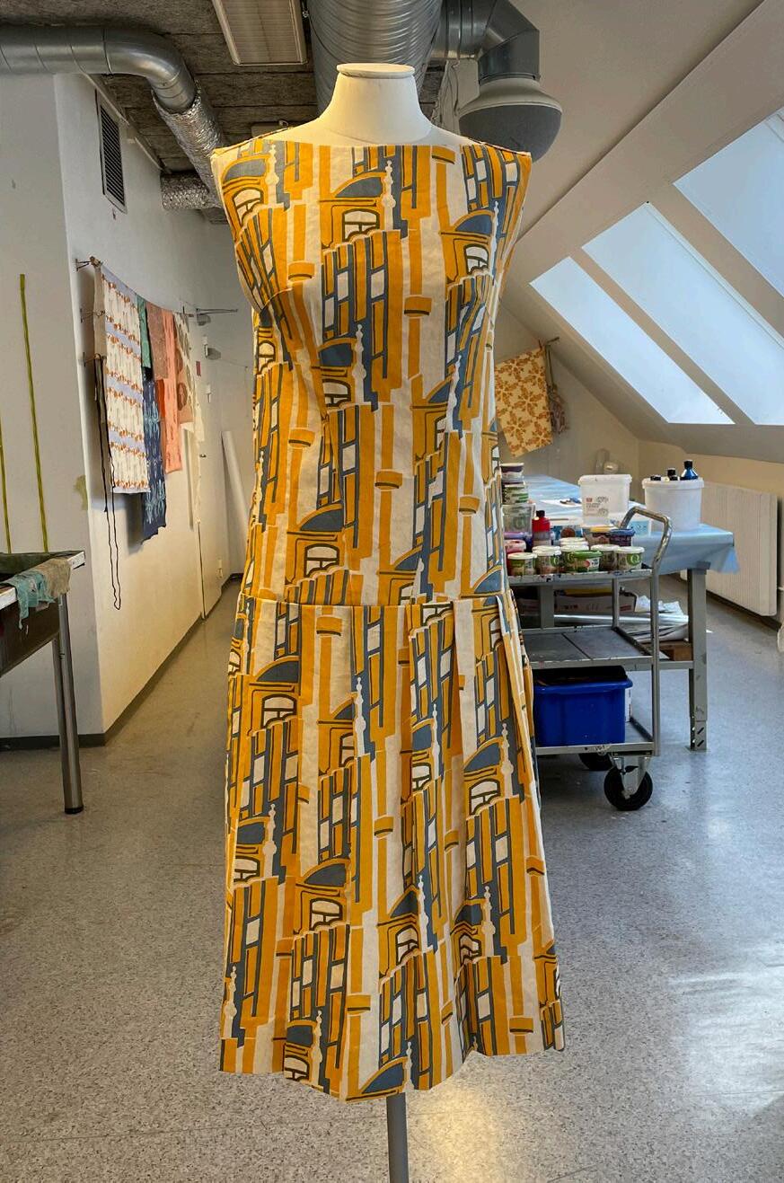 Jeg har laget et art deco-mønster inspirert av arkitekturuttrykket i Oslo, brukt silketrykk for å trykke det på stoff, og sydd stoffet om til en art deco-kjole.