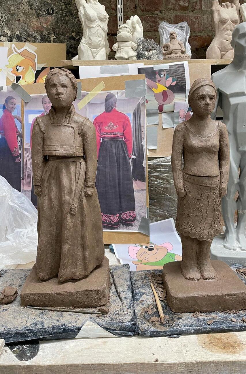 Jeg har laget to skulpturer av leire. To kvinner med forskjellig kultur og bakgrunn. En norsk kvinne med bunad og en surinamsk kvinne med det typiske skjørtet som de bruker i regnskogen.