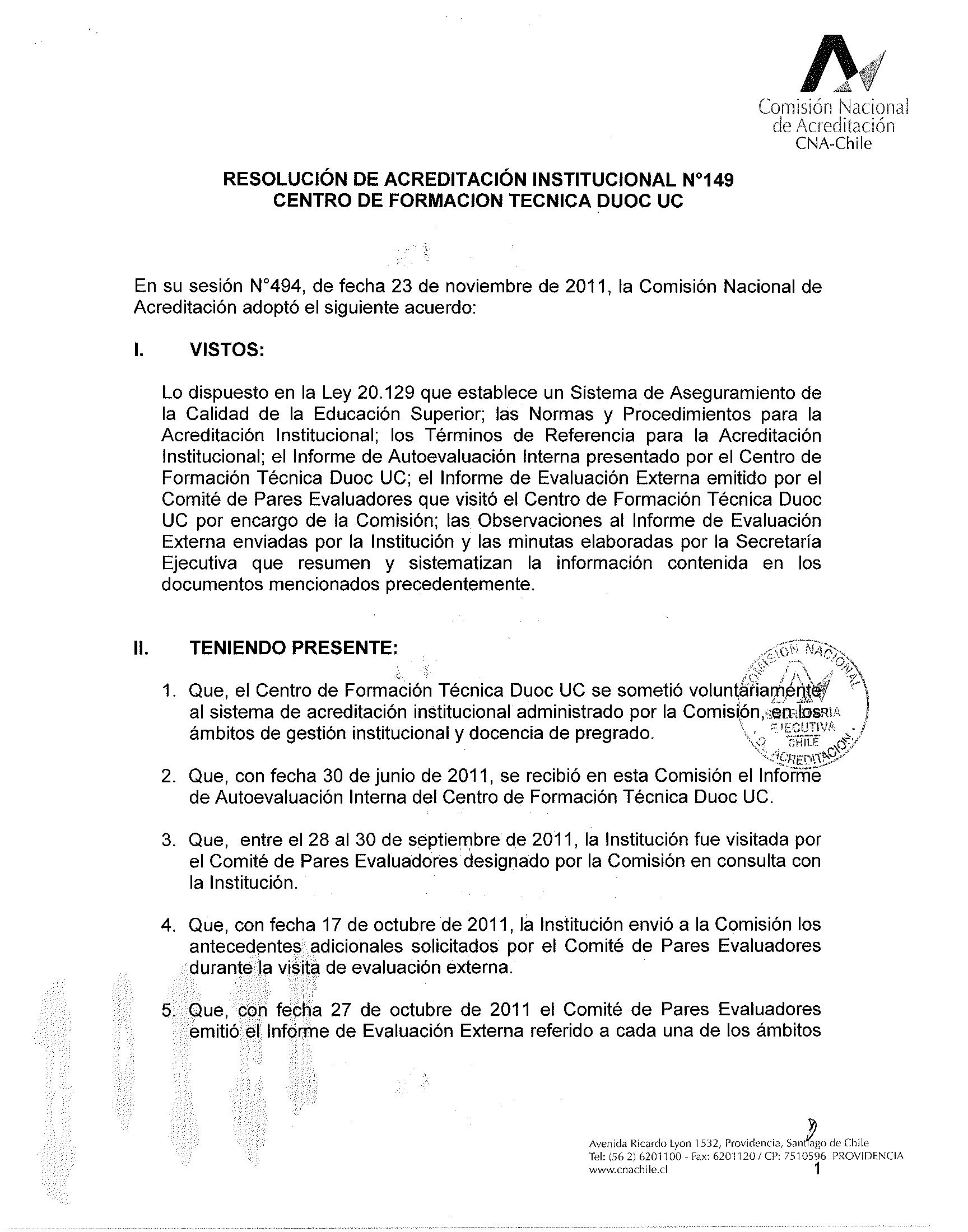 Acreditación Institucional CFT DUOC. Dictamen CNA N° 149.