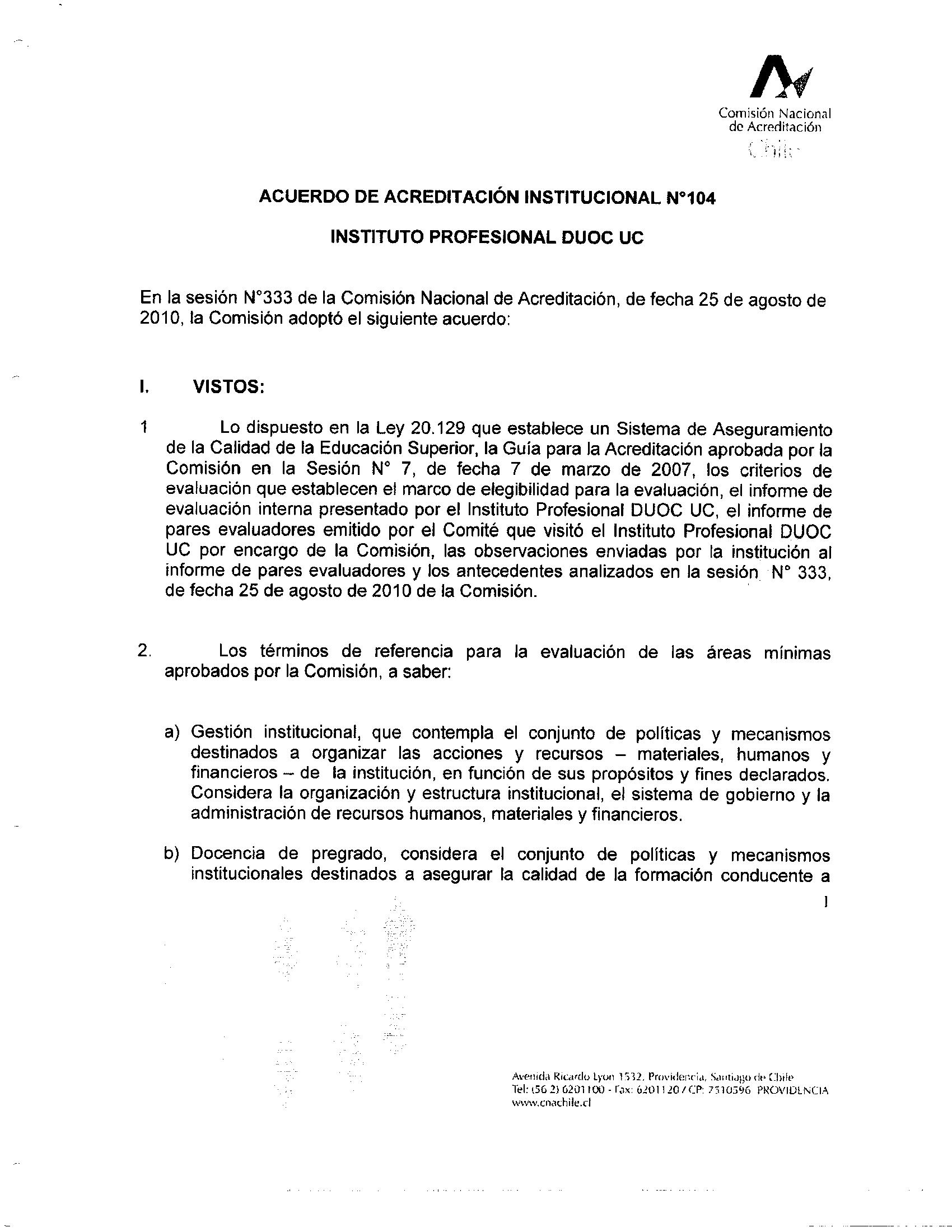Acuerdo de Acreditación Institucional Nº104 IP Duoc UC, 25 de Agosto 2010