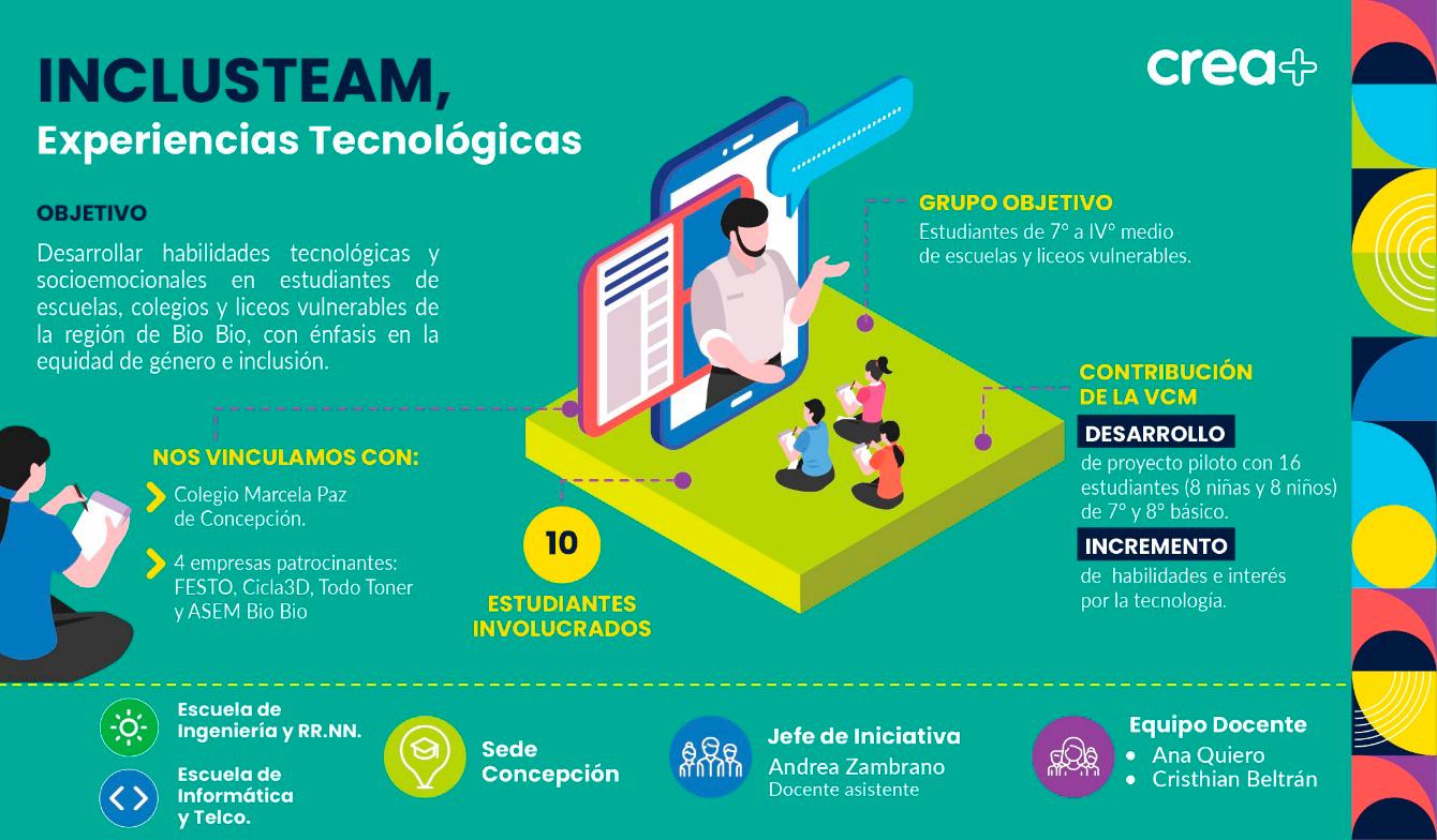 Iniciativa que busca aumentar la participación femenina en el mundo de las Tecnologías de la Información y Comunicación, incluyendo una comunidad interna que promueve el empoderamiento de las mujeres en el área e inspira a niñas y adolescentes a involucrarse en este ámbito. Desde al año 2020, estudiantes y docentes de la Escuela de Informática y Telecomunicaciones lideran distintas acciones que apuntan a estos fines, en vínculo con establecimientos escolares, contribuyendo a la equidad de género en este campo.