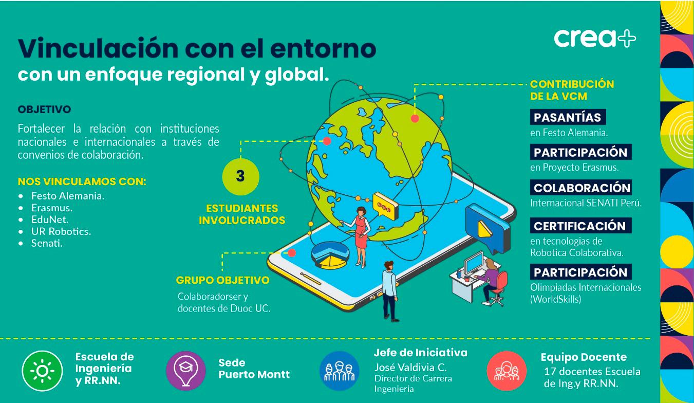 2 CREA: Acrónimo que resulta de las cuatro etapas de una iniciativa de vinculación con el medio que son Conecta, Realiza, Evalúa y Aprende. La Guía CREA+VcM se puede revisar y descargar en https://www.duoc.cl/nosotros/vinculacionconelmedio/guia-vcm/