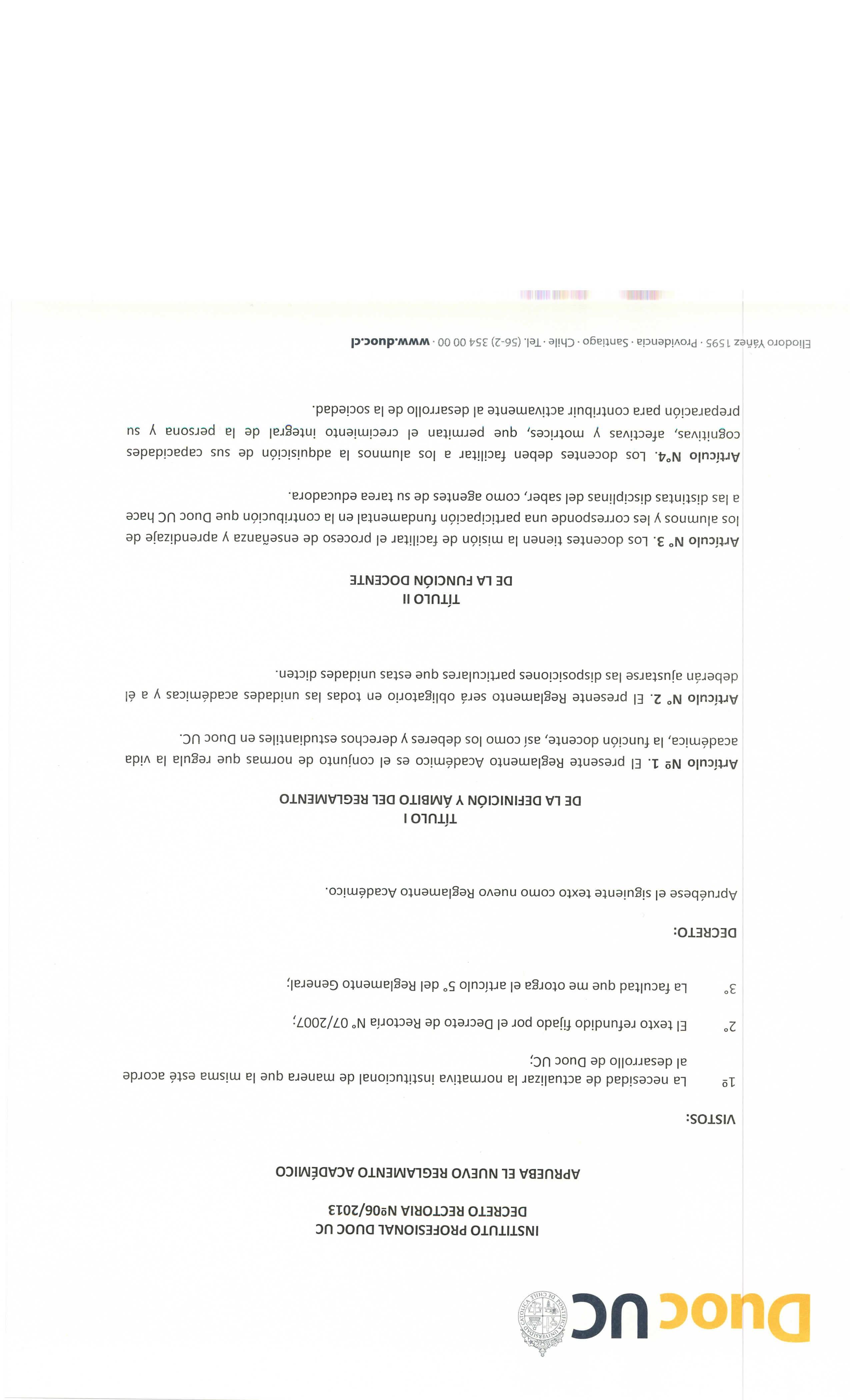 Artículo N° 5 Para lograr una adecuada formación de los alumnos en un conjunto de técnicas específicas que conforman ocupacioneso profesiones, el docente deberá cumplir con cada una de las normas contenidas en este Reglamento y otras que el Vicerrector Académicopueda disponer
