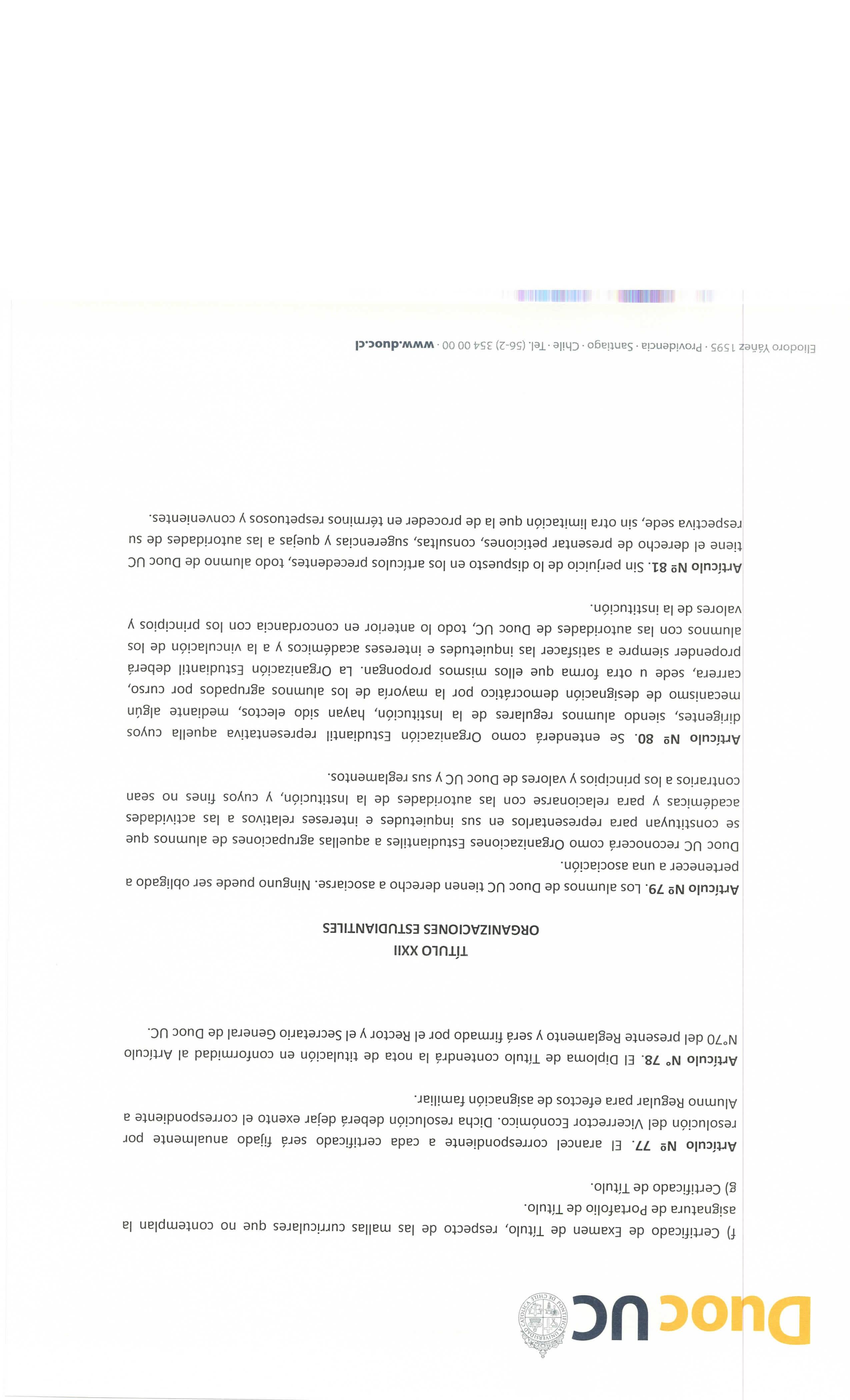 Artículo N° 73 Losalumnos de Duoc UCdeberán respetar y cumplir las disposiciones del presente Reglamento Académico y del Reglamento General, así como las resoluciones e instrucciones impartidas por sus autoridades