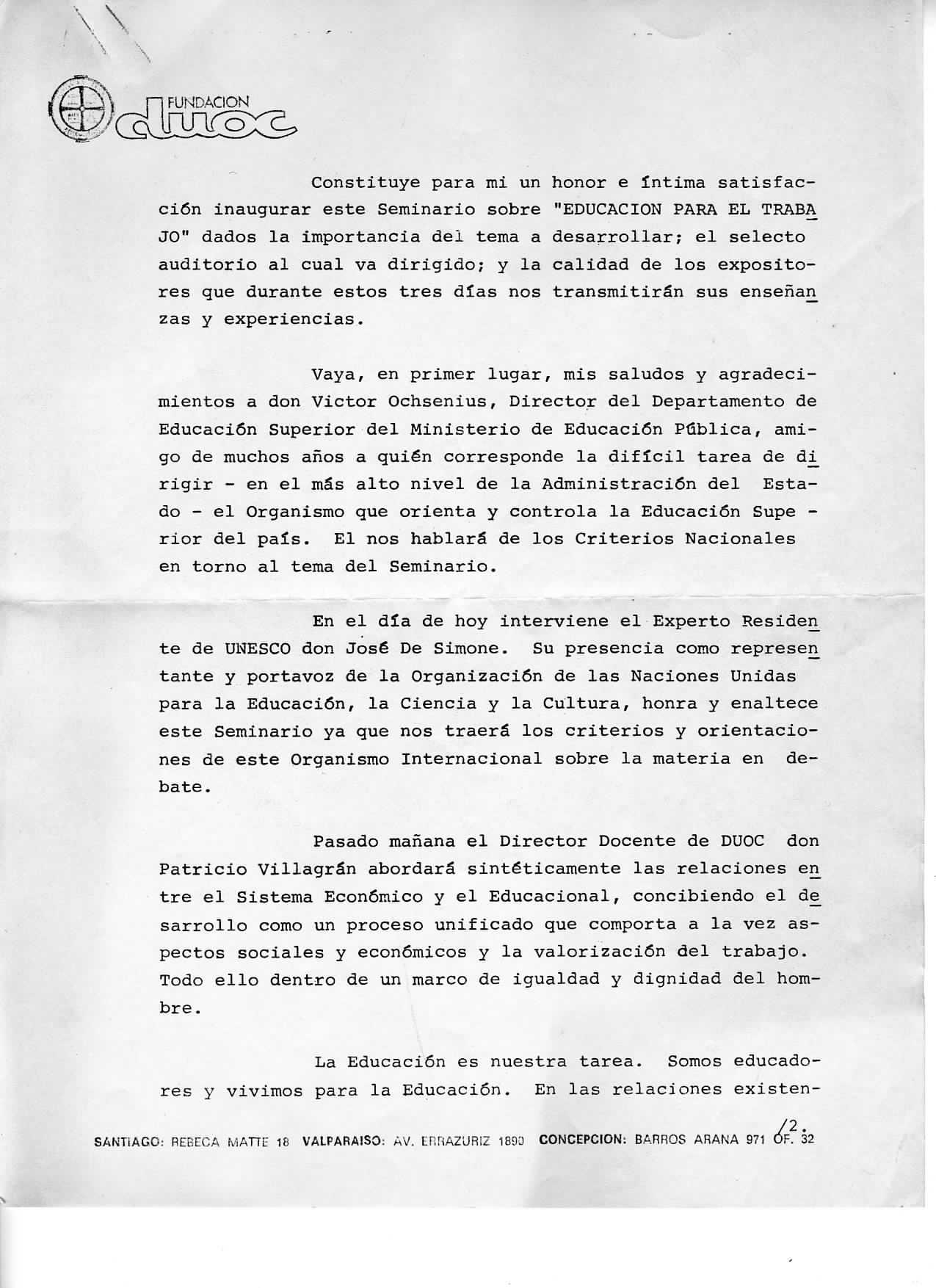 Discurso Rector Hernán Holley en la Inauguración Seminario Educación para el Trabajo 17 Ago. 1982.