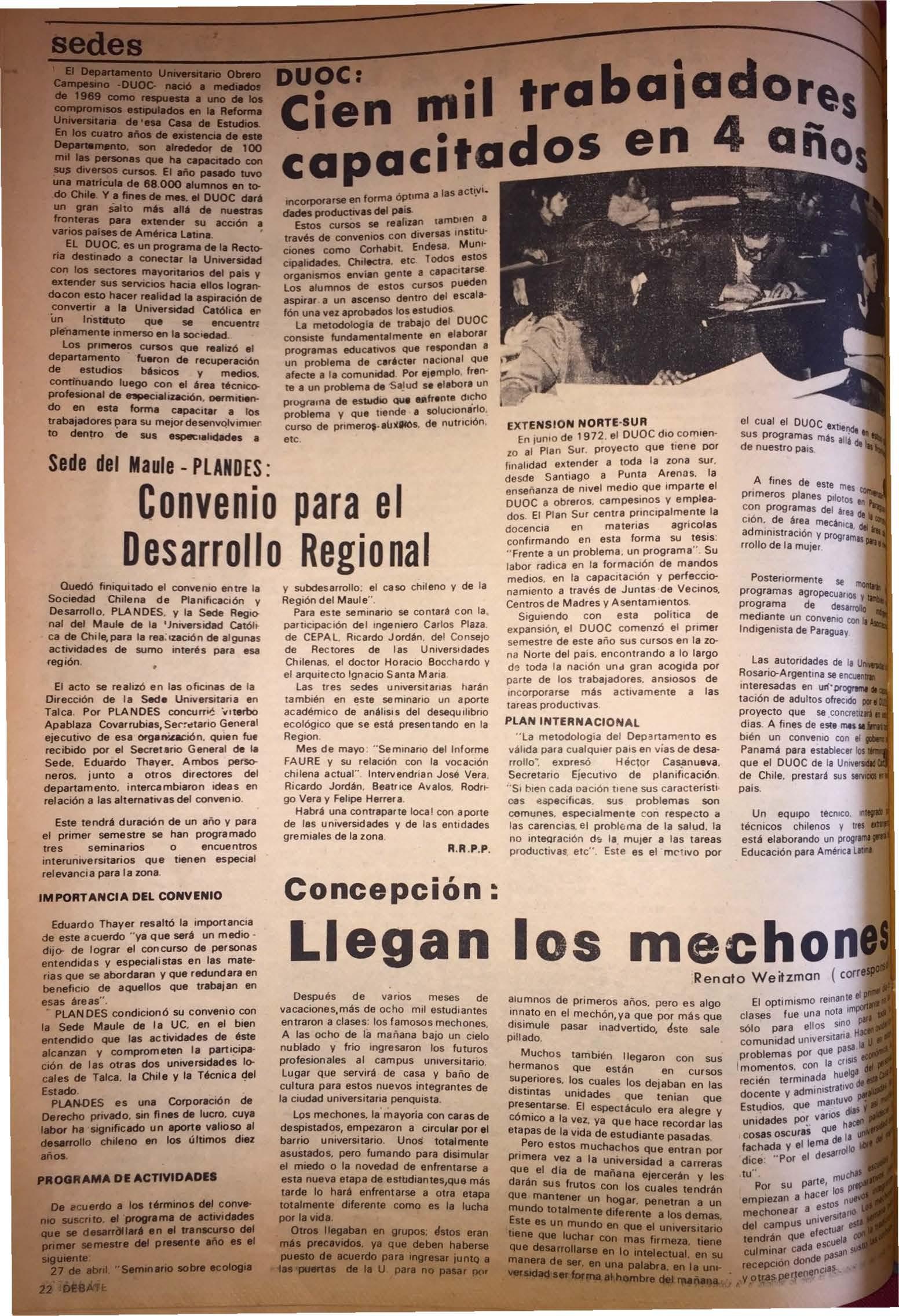 En 1un•o de 1972 el DUOC d•o com•en· zo al Plan Sur proyecto que tiene por llnahdad extender a toda la zona sur desde Sant1ago a Punta Arenas. l a enseñanza de mvel medoo que •mpar t e el DUOC a obreros campesmos y empleados El Plan Sur centra pnnc•palmente l a docencia en matenas agncolas en esta fo r ma su te s1s Frente a un problema un programa·· Su labor rad•ca en la formac•ón de mand os mediOS en la capac1tac1ón V perfecc•onamlento a través de Juntas de Vecmos. Centros de Madres v Asentam•entos