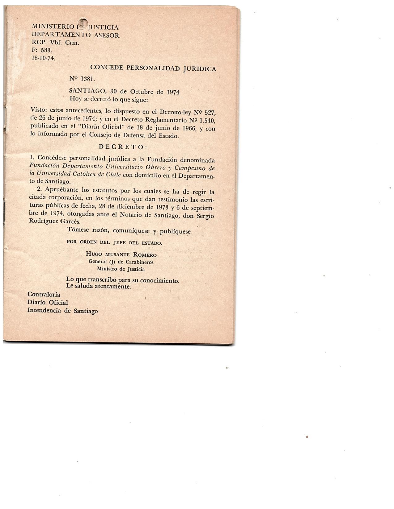 Personalidad jurídica y Primer Estatuto DUOC, octubre de 1974.