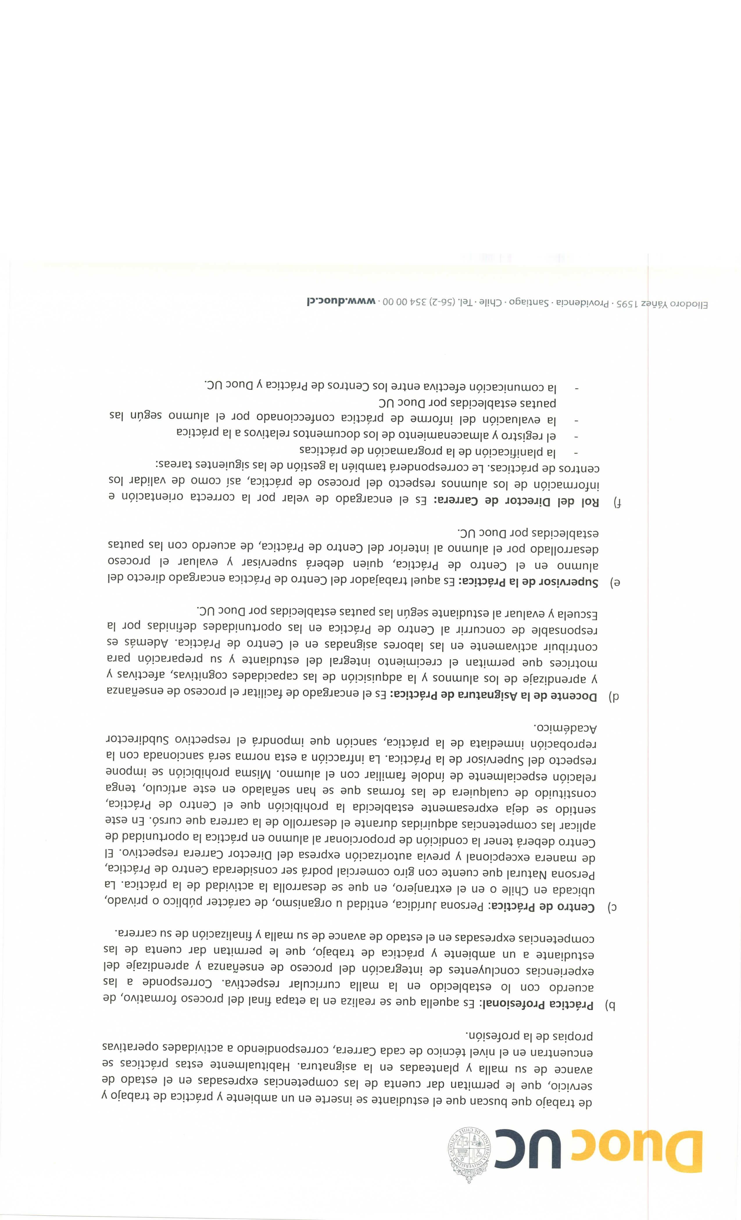 f) Rol del Director de Carrera: Es el encargado de velar por la correcta orientación e información de los alumnos respecto del proceso de práctica, así como de validar los centros de prácticas Lecorresponderá también la gestión de lassiguientes tareas: la planificación de la programación de prácticas el registro y almacenamiento de los documentos relativos a la práctica la evaluación del informe de práctica confeccionado por el alumno según las pautas establecidaspor Duoc UC la comunicación efectiva entre los Centros de Práctica y DuocUC