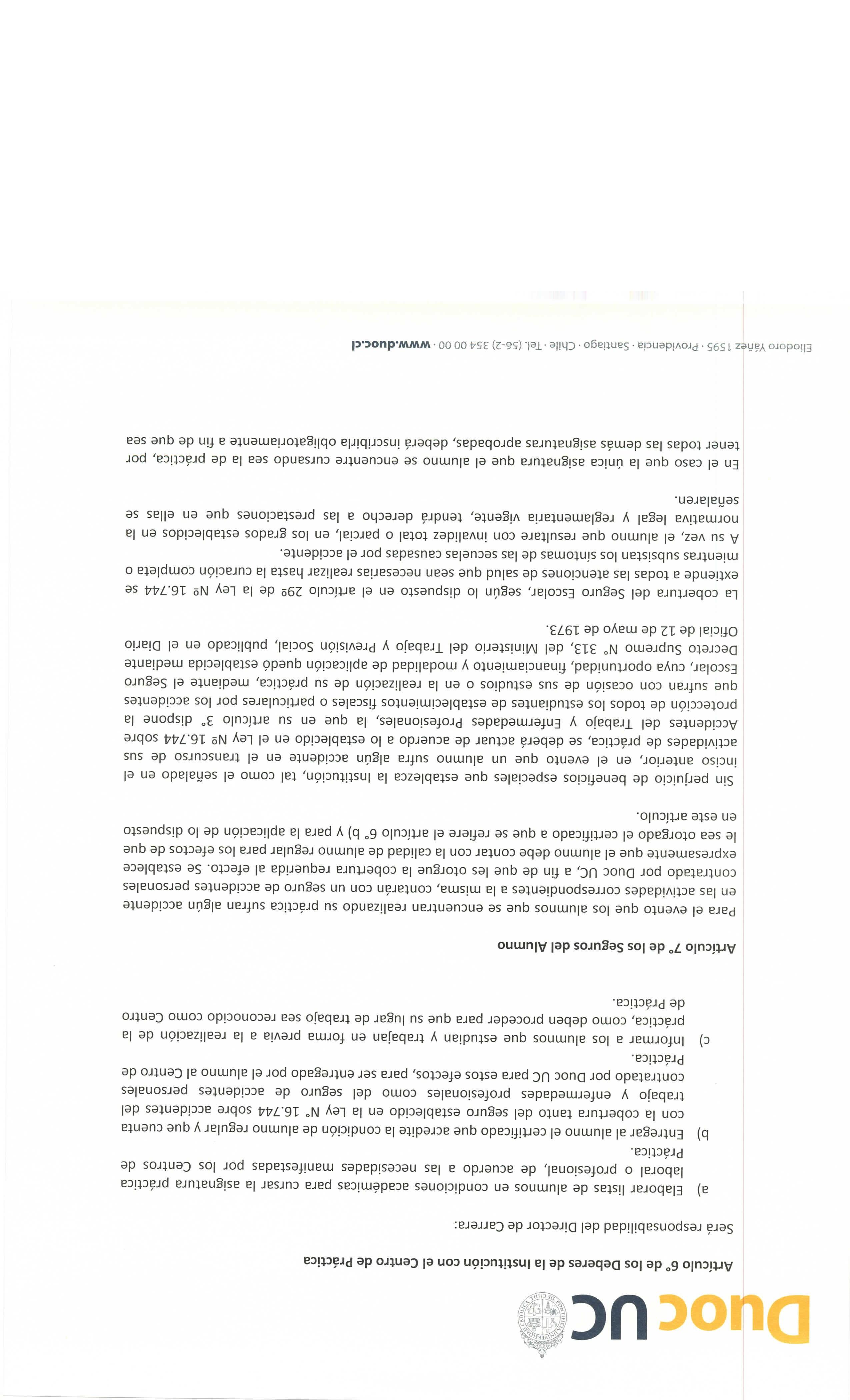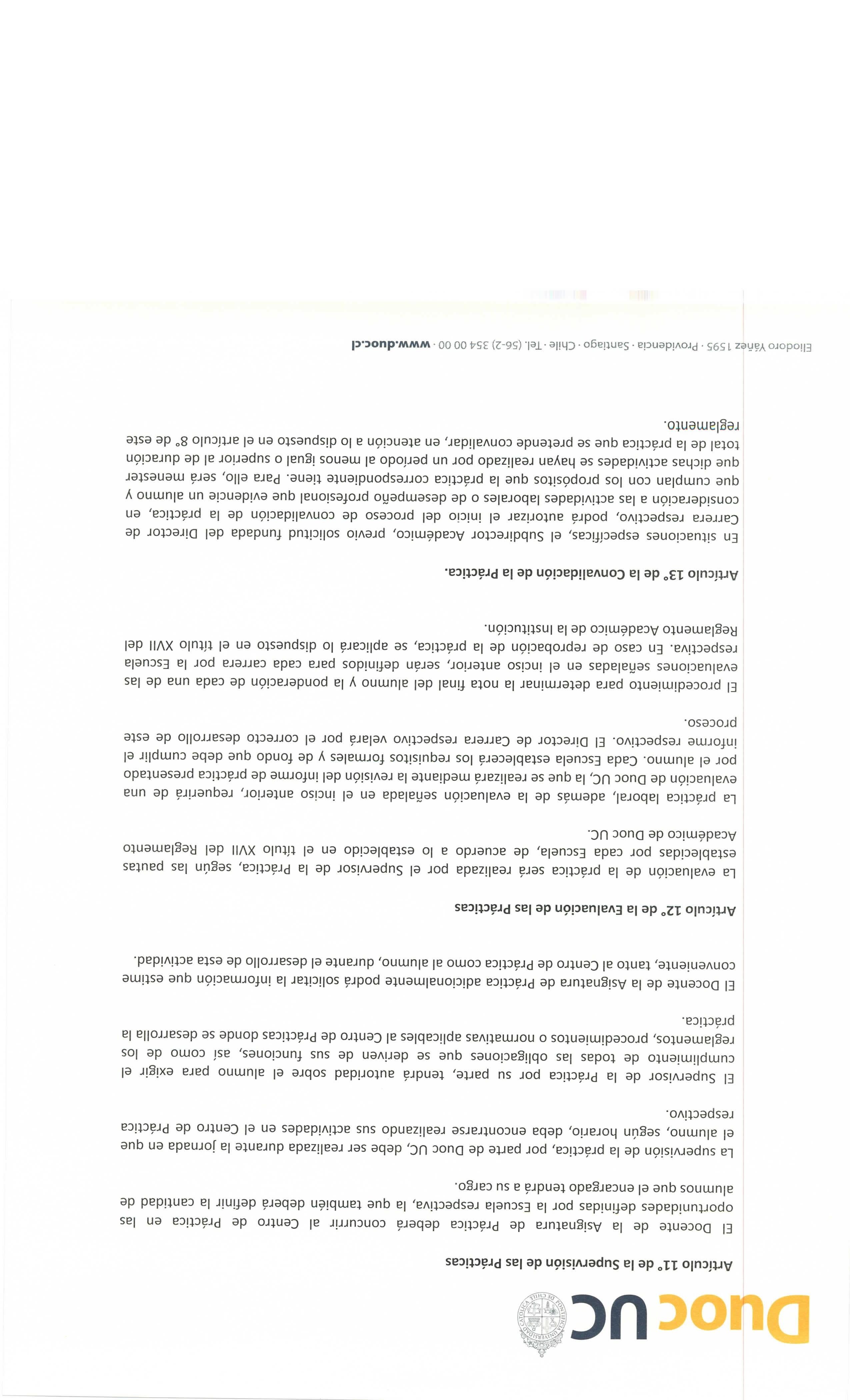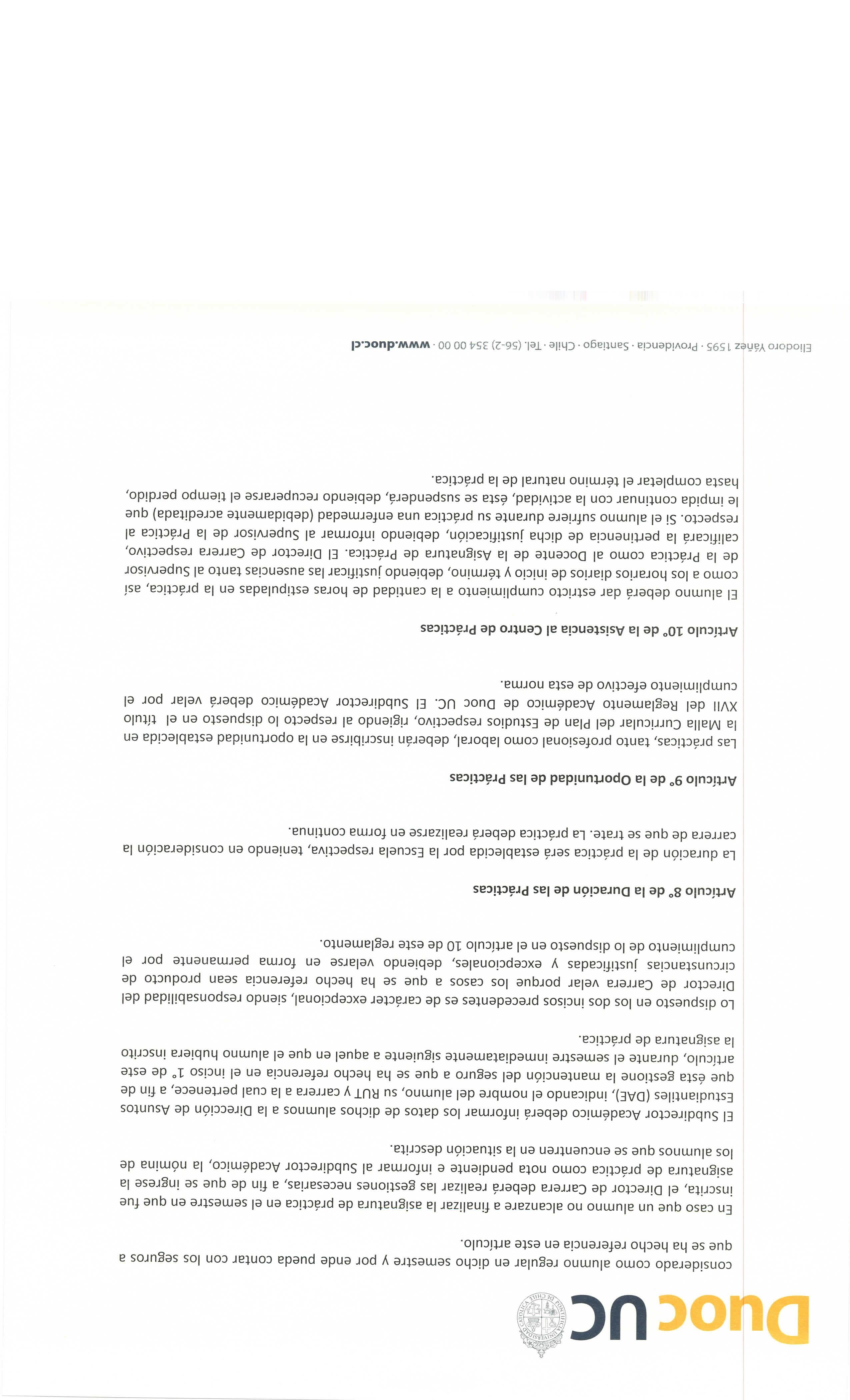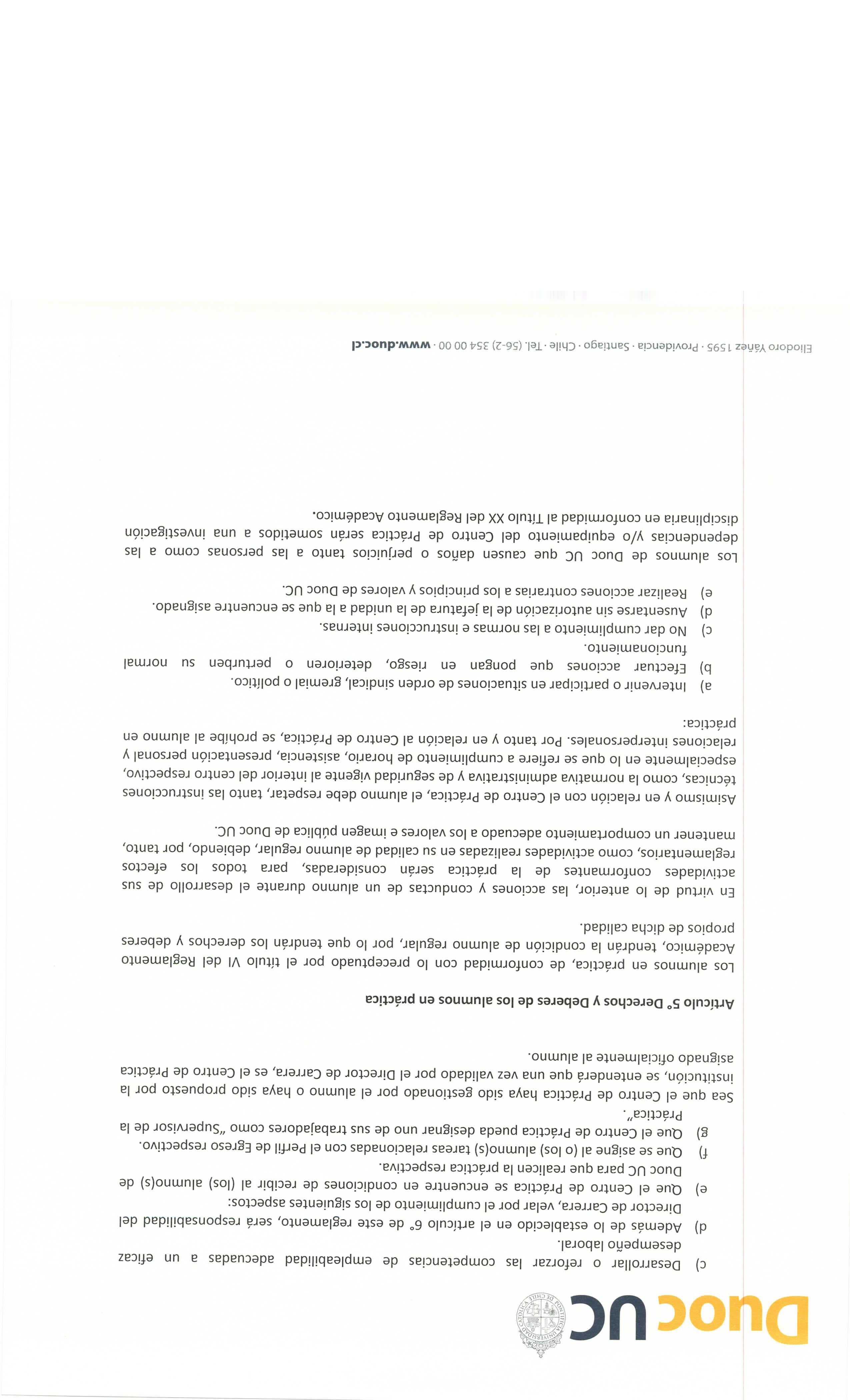 En virtud de lo anterior, las acciones y conductas de un alumno durante el desarrollo de sus actividades conformantes de la práctica serán consideradas, para todos los efectos reglamentarios, como actividades realizadasen sucalidad de alumno regular, debiendo, por tanto, mantener un comportamiento adecuadoa los valorese imagen pública de DuocUC