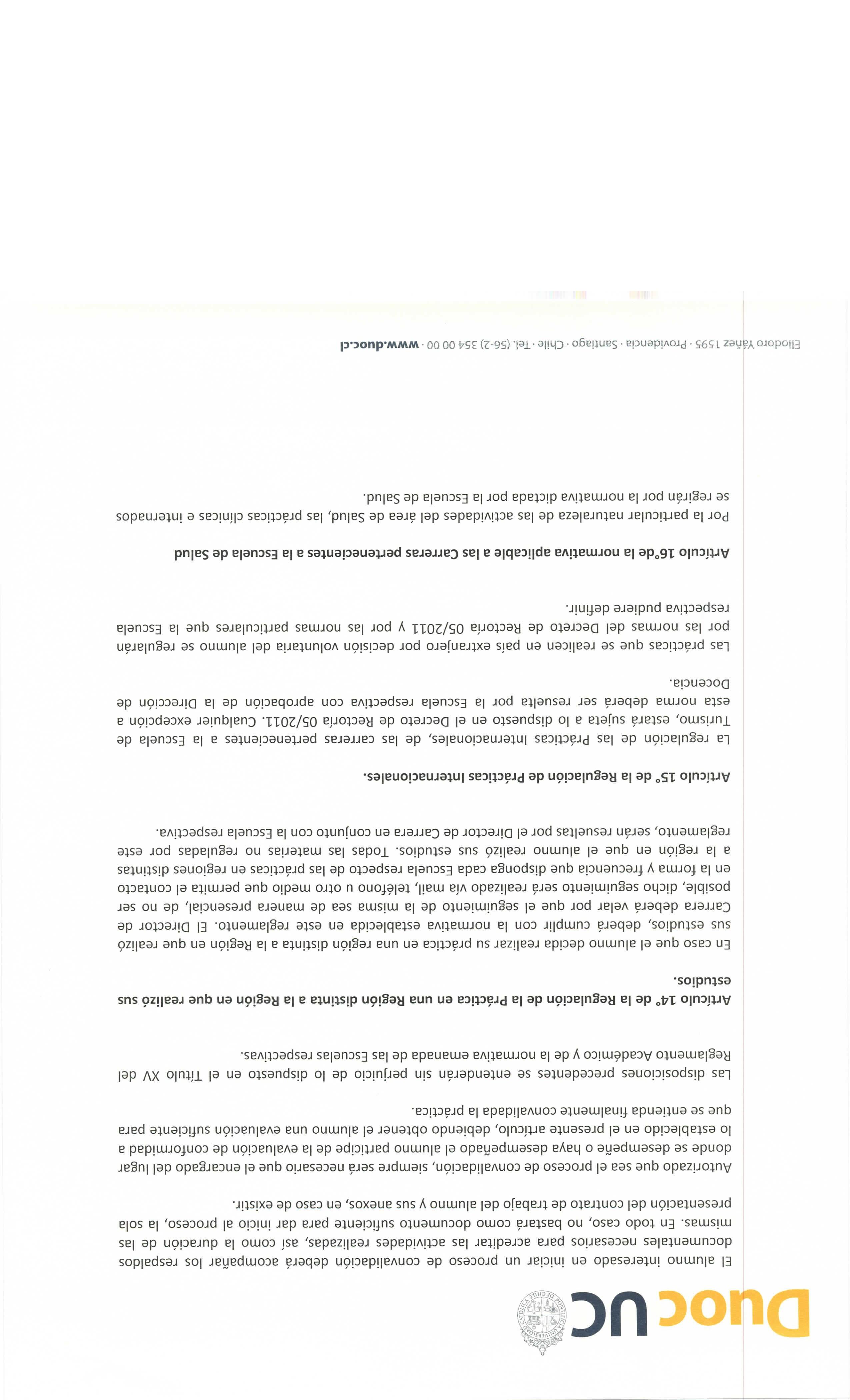 En caso que el alumno decida realizar su práctica en una región distinta a la Región en que realizó sus estudios, deberá cumplir con la normativa establecida en este reglamento El Director de Carrera deberá velar por que el seguimiento de la misma sea de manera presencial, de no ser posible, dicho seguimiento será realizado vía mail, teléfono u otro medio que permita el contacto en la forma y frecuencia que disponga cada Escuela respecto de las prácticasen regiones distintas a la región en que el alumno realizó sus estudios Todas las materias no reguladas por este reglamento, serán resueltas por el Director de Carreraen conjunto con la Escuela respectiva