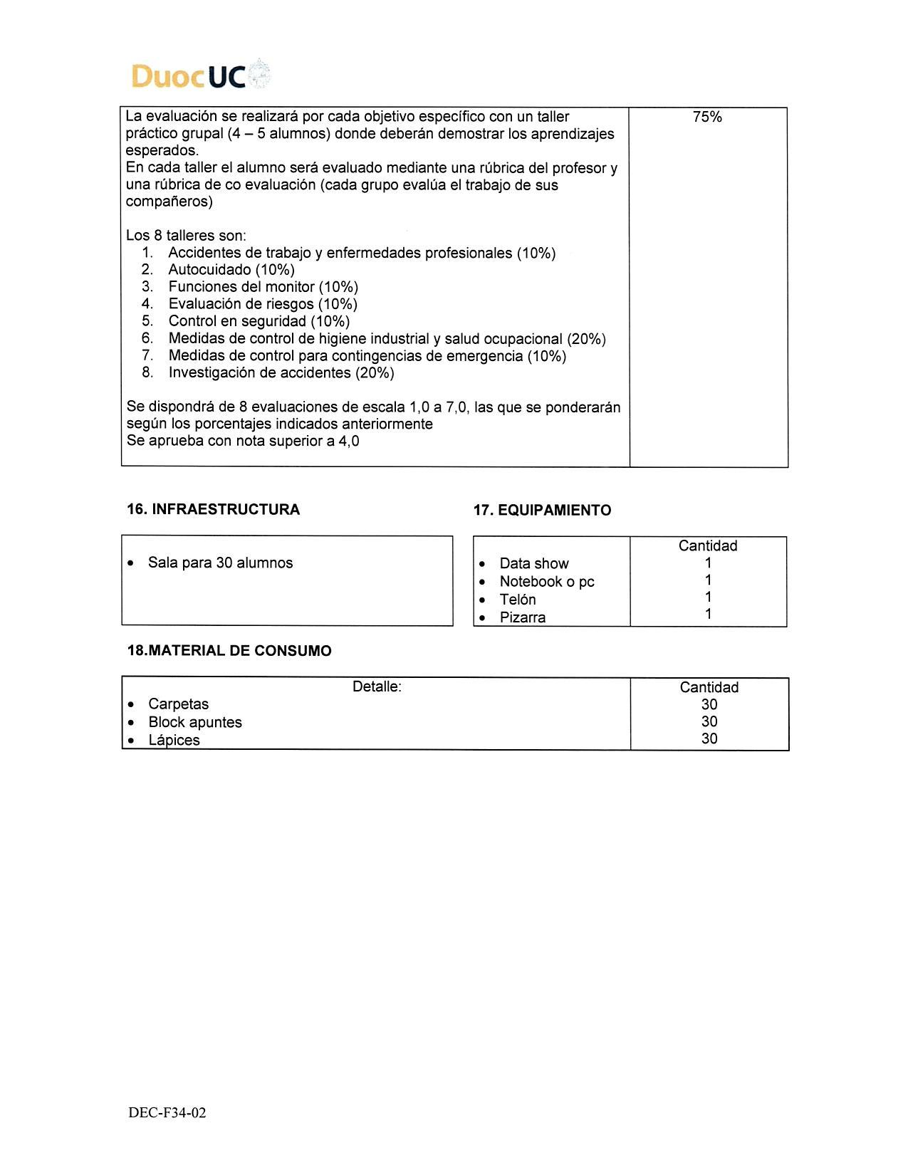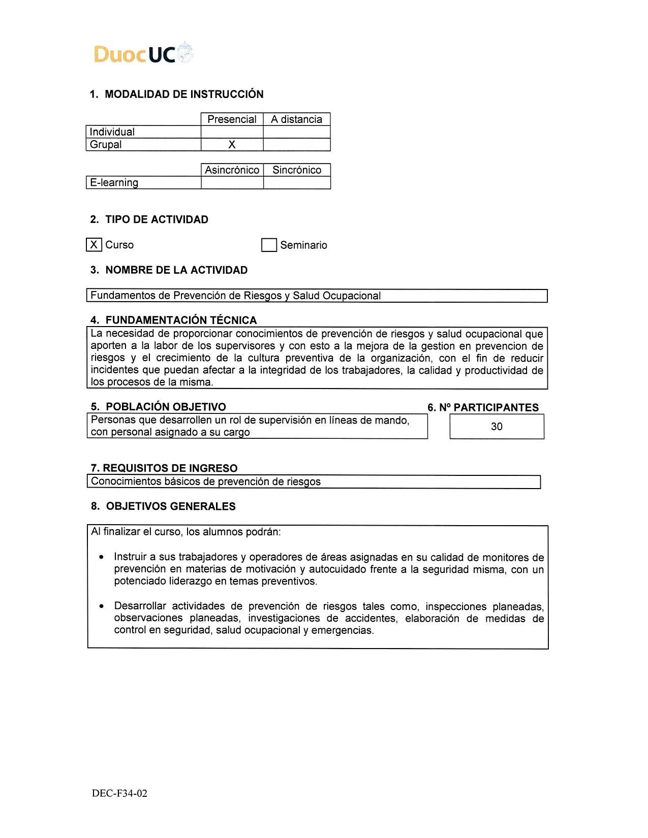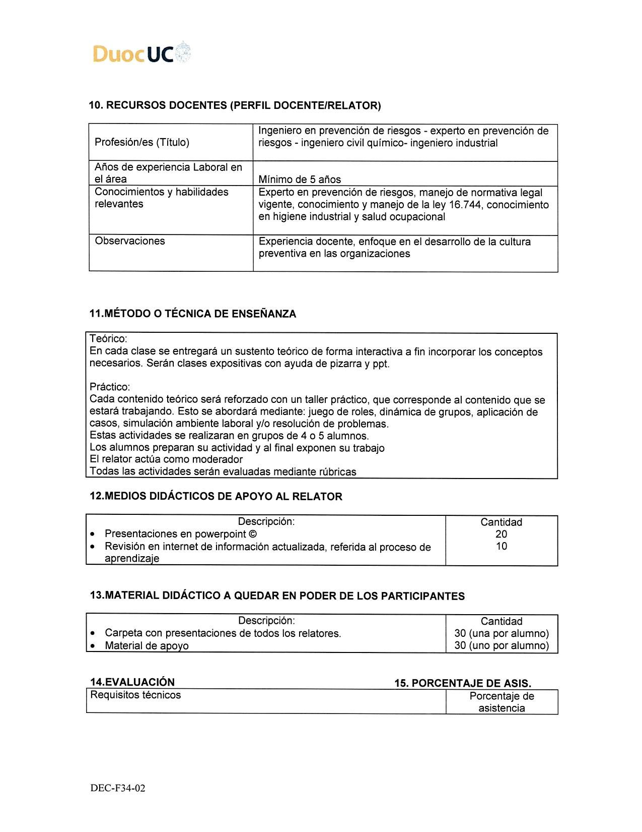 El Diplomado tiene una duración de 100 horas cronológicas, para un máximode30 alumnos por sección. Paraobtener el Diplomado los participantes deberán aprobar los cursosde Fundamentos de Prevención de Riesgos y Salud Ocupacional, y Comunicacióny Manejode Conflictos.