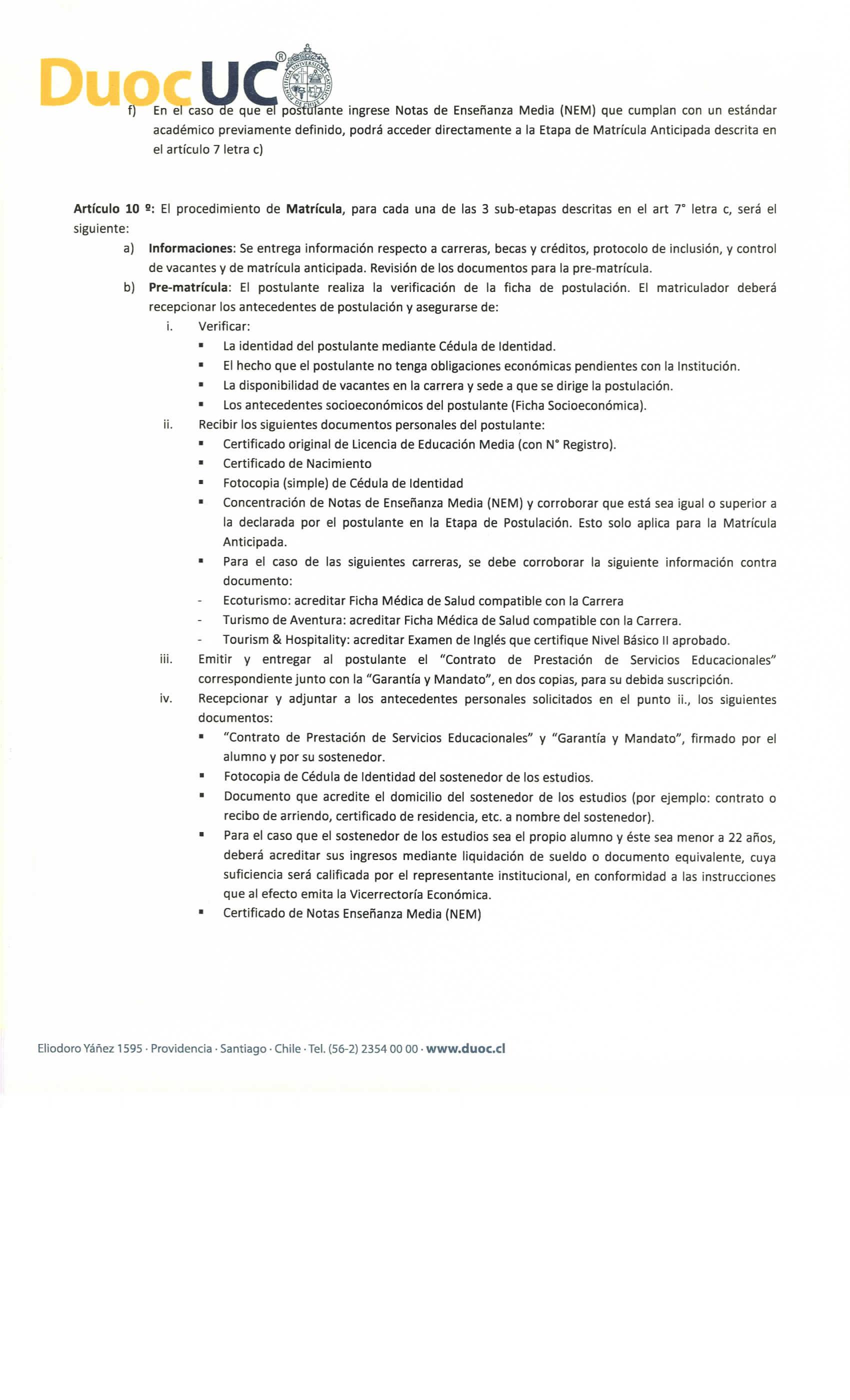 Articulo 10 2; El procedimiento de Matrícula, para cada una de las 3 sub-etapas descritas en el art T letra c, será e! siguiente: