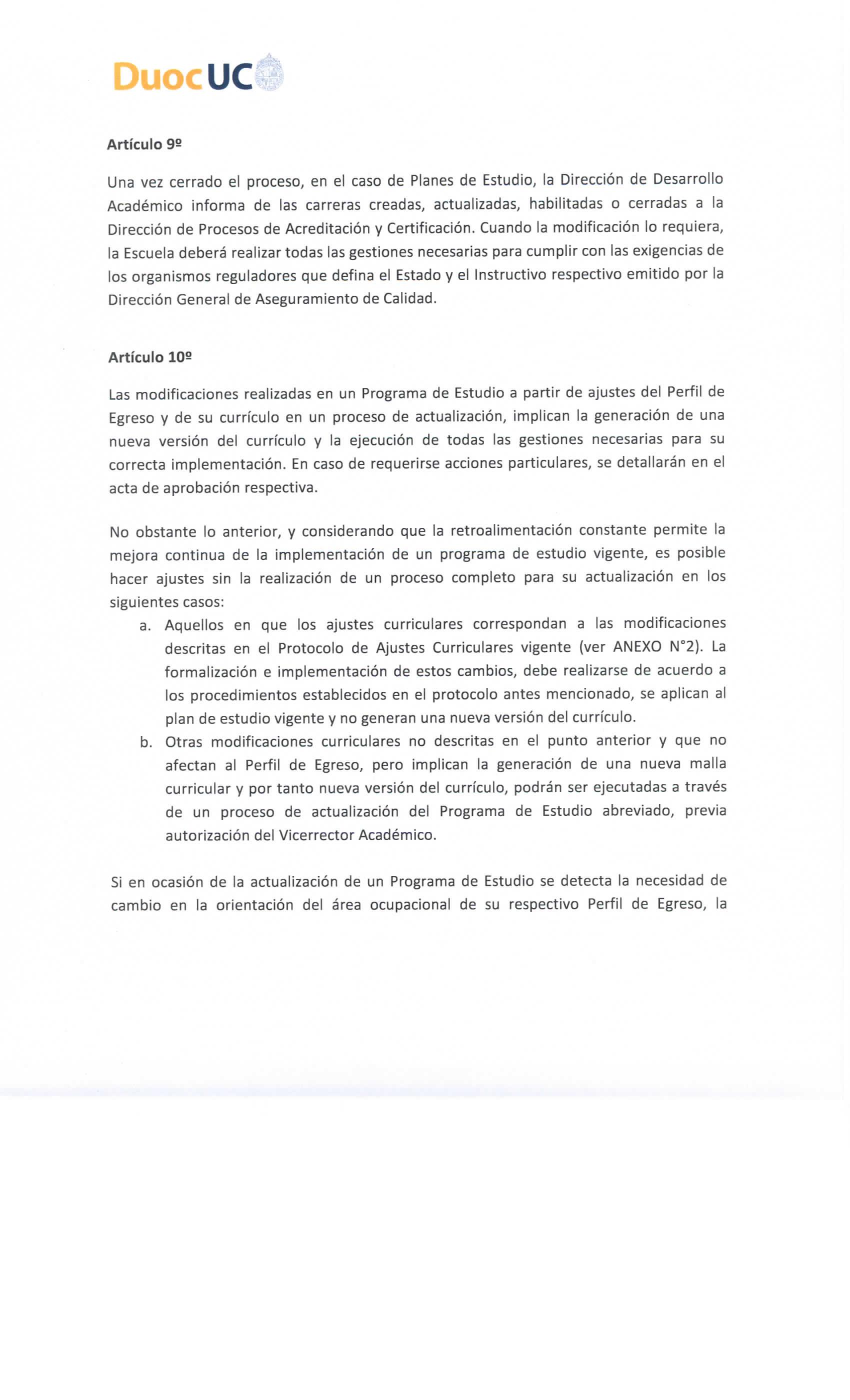 Una vez cerrado el proceso, en el caso de Planes de Estudio, la Dirección de Desarrollo Académico informa de las carreras creadas, actualizadas, habilitadas o cerradas a la Dirección de Procesos de Acreditación y Certificación. Cuando la modificación lo requiera, la Escuela deberá realizar todas las gestiones necesarias para cumplir con las exigencias de los organismos reguladores que defina el Estado y el Instructivo respectivo emitido por la Dirección General de Aseguramiento de Calidad