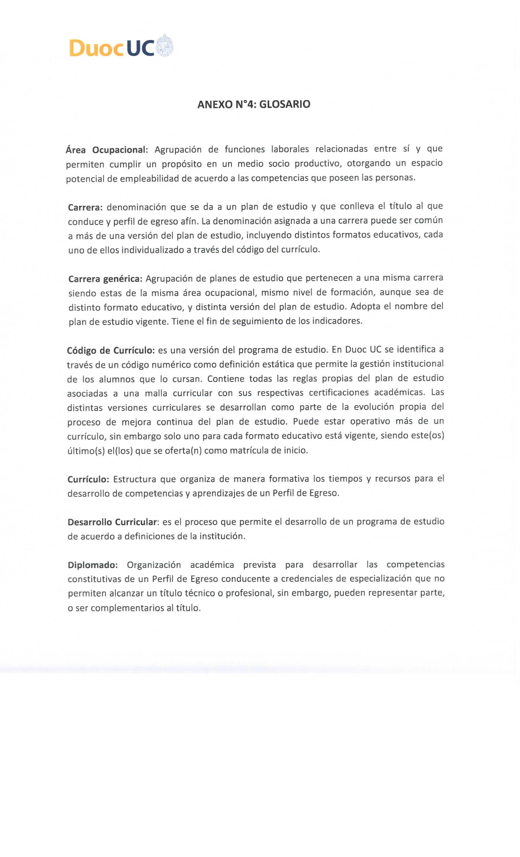 Código de Currículo: es una versión del programa de estudio. En Duoc UC se identifica a través de un código numérico como definición estática que permite la gestión institucional de los alumnos que lo cursan Contiene todas las reglas propias del plan de estudio asociadas a una malla curricular con sus respectivas certificaciones académicas Las distintas versiones curriculares se desarrollan como parte de la evolución propia del proceso de mejora continua del plan de estudio Puede estar operativo más de un currículo, sin embargo solo uno para cada formato educativo está vigente, siendo este(os) último(s) el(los) que se oferta(n) como matrícula de inicio.