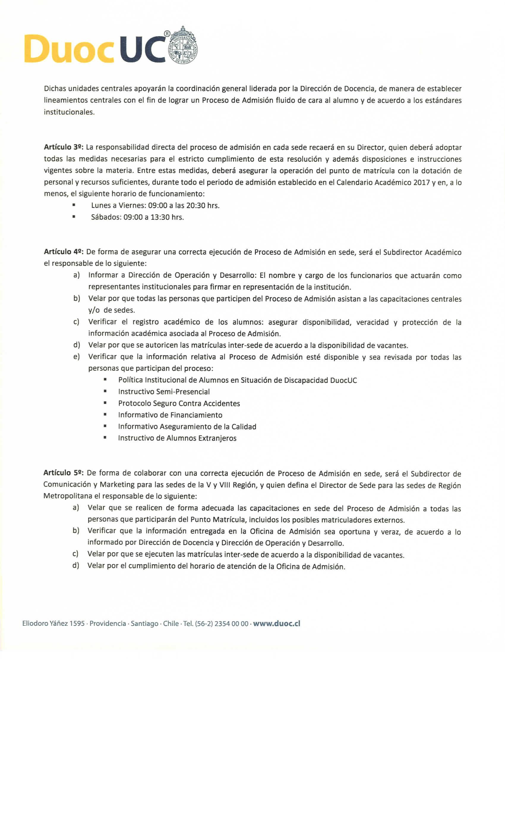 Artículo 32: La responsabilidad directa del proceso de admisión en cada sede recaerá en su Director, quien deberá adoptar todas las medidas necesarias para el estricto cumplimiento de esta resolución y además disposiciones e instrucciones vigentes sobre la materia Entre estas medidas, deberá asegurar la operación del punto de matrícula con la dotación de personal y recursos suficientes, durante todo el periodo de admisión establecido en el Calendario Académico 2017 y en, a lo menos, el siguiente horario de funcionamiento: Lunes a Viernes: 09:00 a las 20:30hrs