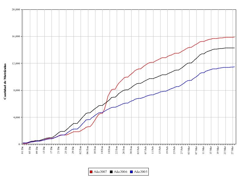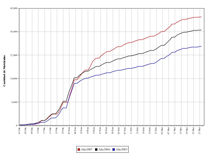 2) La matrícula de inicio alcanzó los 15.939 alumnos con un crecimiento de 11.3%, la matrícula de continuidad llegó a los 24.049 alumnos y una variación de 19,0% respecto del 2006 y la matrícula de Admisión Especial, alcanzó un total de 1.905 alumnos mostrando una disminución de 16.6% respecto del proceso anterior.