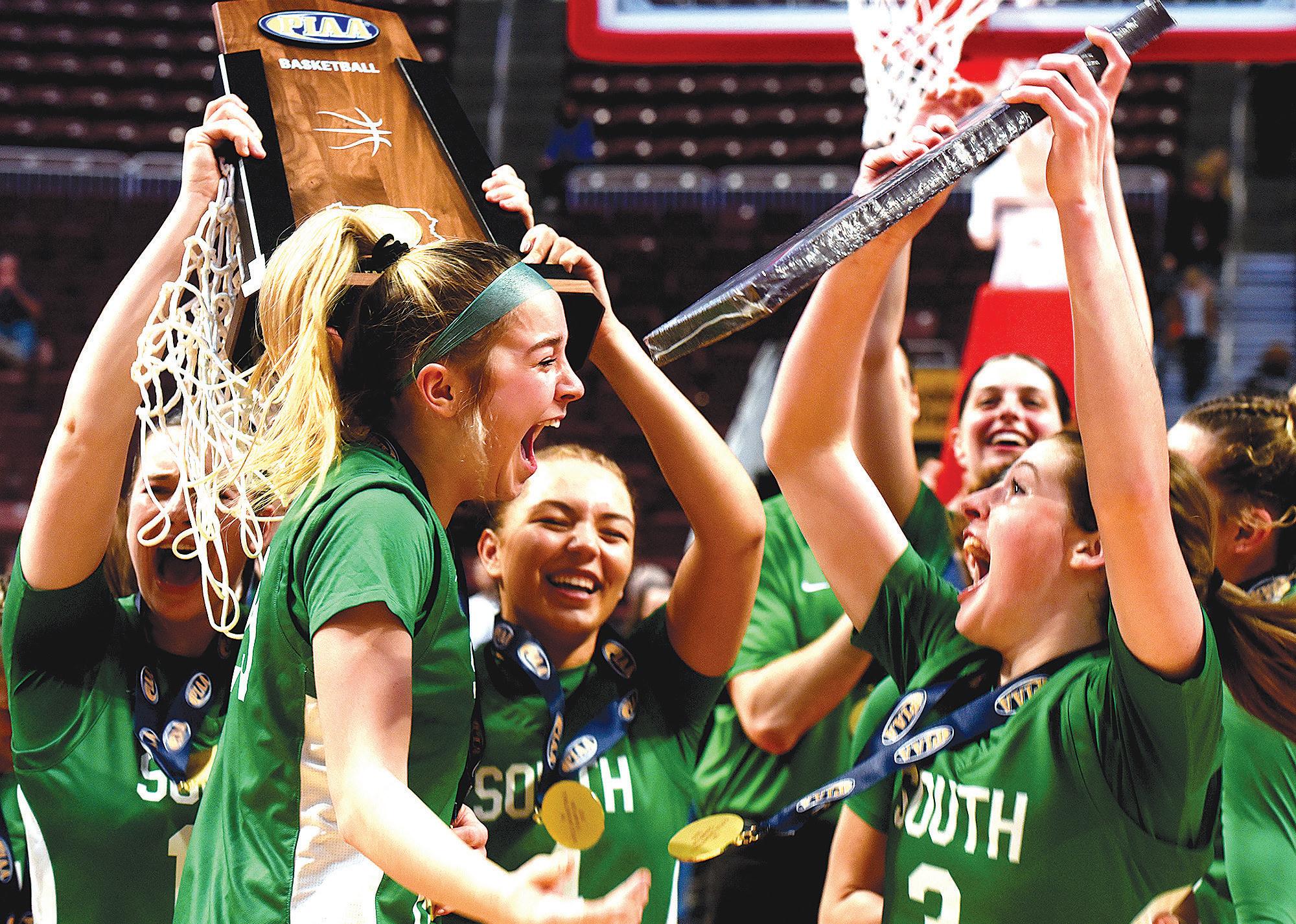 Members of the South Fayette girls basketball team celebrate with the championship trophy in March after defeating Archbishop Wood, 45-37, in the PIAA Class 5A title game at the Giant Center in Hershey. The win capped a 29-2 season for the Lions.