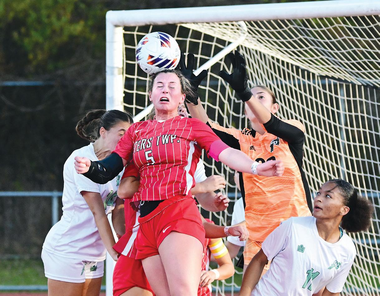 Peters Township's Camryn Klein (5) heads the ball in front of Central Dauphin goalkeeper Mikala Matincheck in the first half of the PIAA Class 4A girls soccer playoff match at Confluence Financial Partners Stadium in November.