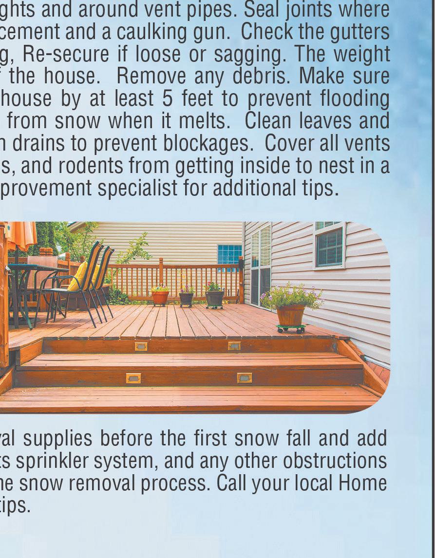 walkways and driveways for any damage and make repairs now so water will not seep in and cause further issues with freeze-thaw cycles. Consider applying a sealant to protect surfaces from snow and ice.