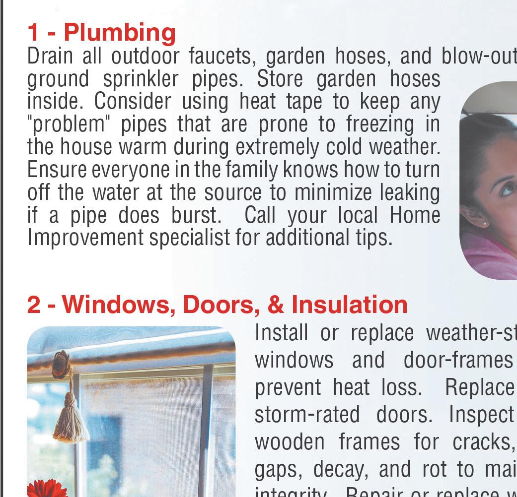 Insulate and drain: Don’t risk damage to pipes, which can freeze and crack in the cold. Shut off the water supply to exterior faucets and drain water lines to prevent pipes from freezing and