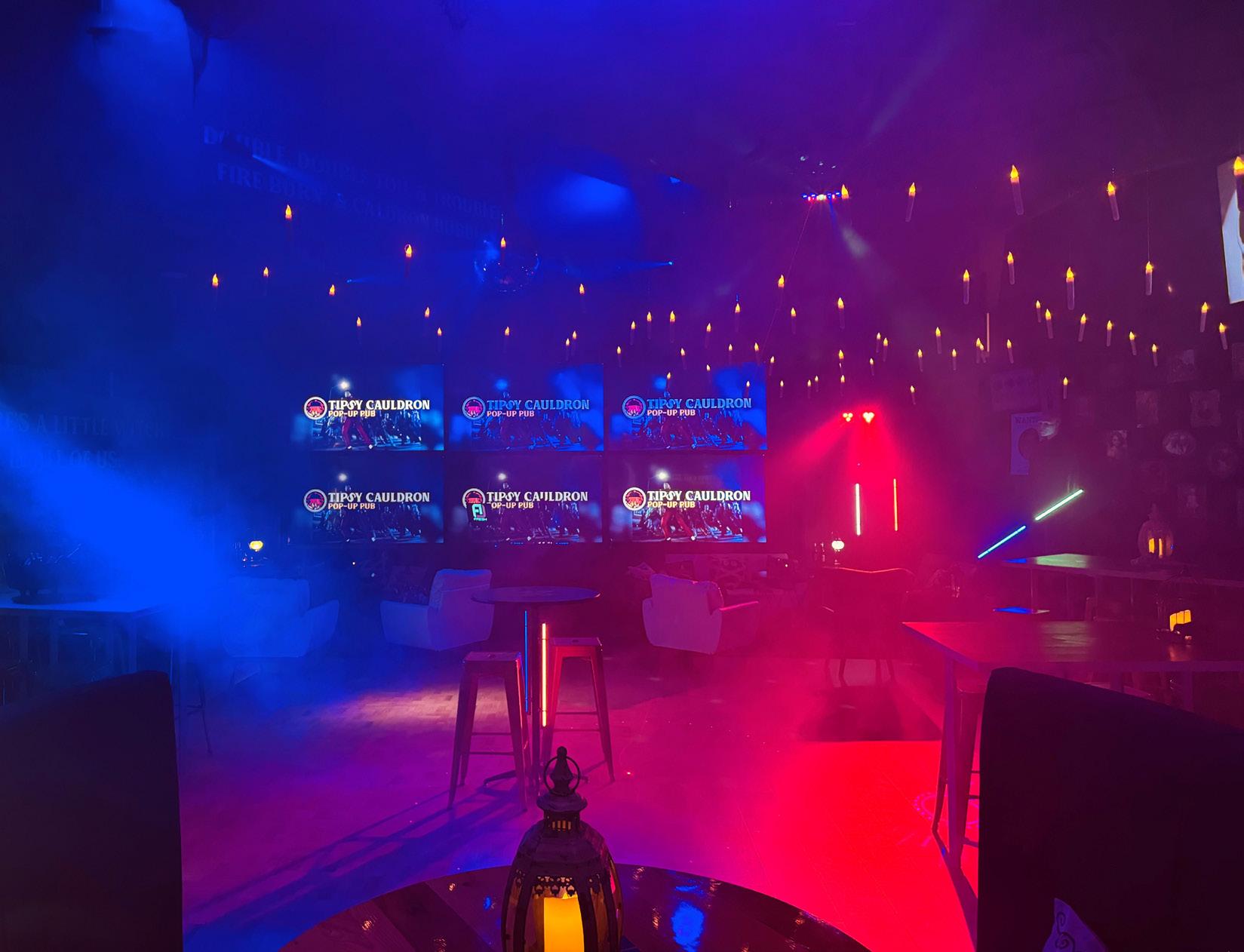 The ambiance of this pop-up bar transports guests to a witchy haven, complete with purple decor, floating candles, spell books, potions, owls and rats throughout the room, all cloaked in a foggy atmosphere.