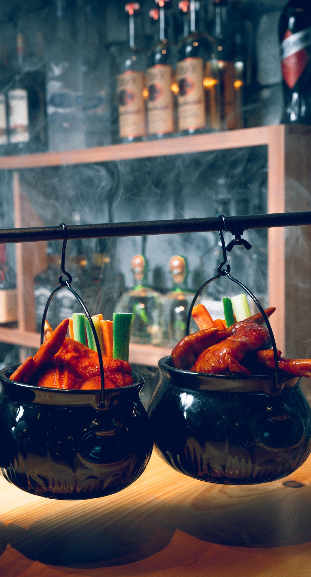 9 Whole Wings, Tossed in Your Choice of Sauces, Served in a Cauldron with Carrots & Celery