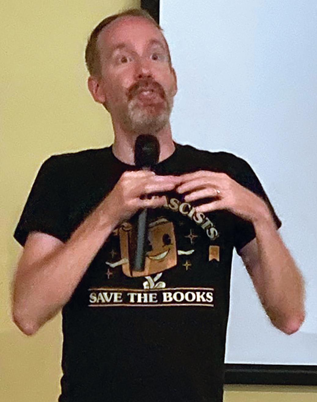 Wearing a T-shirt that said, “Ban the fascists, save the books,” Powell took aim at individuals and groups that have tried to have books banned from schools and libraries around the country. Graphic novels, like those that Powell creates, are frequently targeted in book-banning drives. Earlier this year, Mt. Lebanon Library declared itself a “book sanctuary” that will protect endangered books. Book banners “care about power and control,” Powell said.