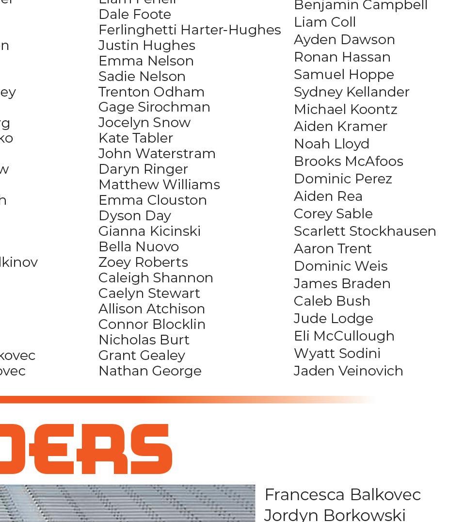 Bishop Canevin Marching Crusaders (Band and Crusettes): Band: Wyatt Allen-Greer, Cooper Evans, Will Gehrlein, Cate Hites, Fionn Hites (drum major), Walter Leithauser-Mihalega, Cece Rung, Jeffry Spina, Will Steimer, Kendall Venturino, Gemma Verdun, Luke Verdun, and Emerson Witter Vaughn Crusettes: Cali Evans (captain), Samantha Bittner, Lilian Ulrich, Marli Hornack, Lizzy Fuchs, Casey Marston, Piper Leppert-Bell and Rebekah Roun