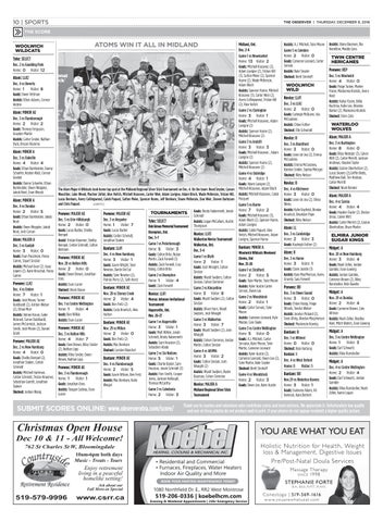Midget: A Dec. 4 vs Centre Wellington Home: 2 Visitor: 4 Goals: Earl Schwartz, Jordan Gamble Assists: Riley Runstedler, Noah Zeller, Aaron Logan