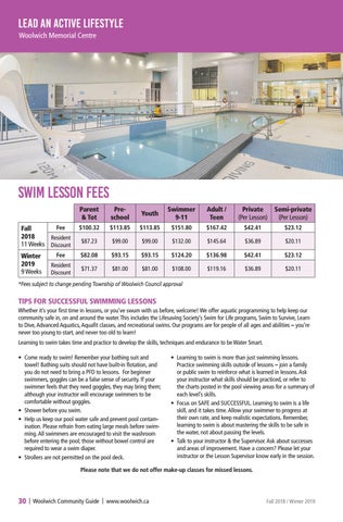 TIPS FOR SUCCESSFUL SWIMMING LESSONS Whether it’s your first time in lessons, or you’ve swum with us before, welcome! We offer aquatic programming to help keep our community safe in, on and around the water. This includes the Lifesaving Society’s Swim for Life programs, Swim to Survive, Learn to Dive, Advanced Aquatics, Aquafit classes, and recreational swims. Our programs are for people of all ages and abilities – you’re never too young to start, and never too old to learn! Learning to swim takes time and practice to develop the skills, techniques and endurance to be Water Smart. • Come ready to swim! Remember your bathing suit and towel! Bathing suits should not have built-in flotation, and you do not need to bring a PFD to lessons. For beginner swimmers, goggles can be a false sense of security. If your swimmer feels that they need goggles, they may bring them; although your instructor will encourage swimmers to be comfortable without goggles. • Shower before you swim. • Help us keep our pool water safe and prevent pool contamination. Please refrain from eating large meals before swimming. All swimmers are encouraged to visit the washroom before entering the pool; those without bowel control are required to wear a swim diaper. • Strollers are not permitted on the pool deck.
