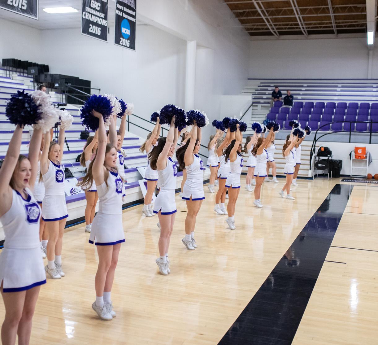 The OBU cheer squad cheers on the women’s basketball team during a game against Southwestern Oklahoma State University. (photo by Meghann Bledsoe)
