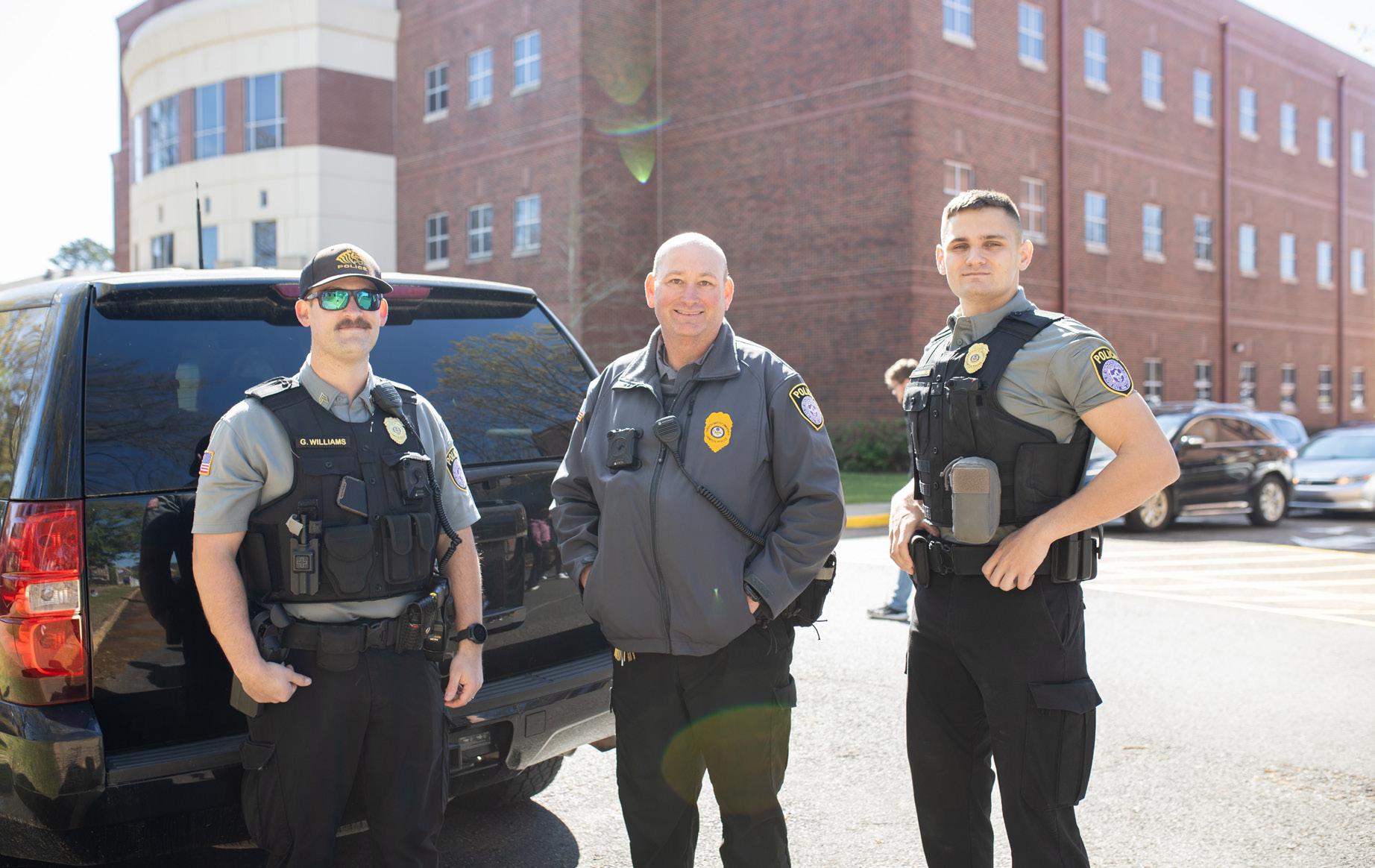 Officers Grant Williams, David Howerton and Charlie Parkinson stand outside of Jones Performing Arts Center. Officers stood outside as students entered and exited chapel service, ensuring safety for all crossing the street. (photo by Meghann Bledsoe)