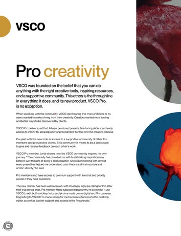 Pro creativity VSCO was founded on the belief that you can do anything with the right creative tools, inspiring resources, and a supportive community. This ethos is the throughline in everything it does, and its new product, VSCO Pro, is no exception. When speaking with the community, VSCO kept hearing that more and more of its users wanted to make a living from their creativity. Creators wanted more tooling and better ways to be discovered by clients. VSCO Pro delivers just that. All new pro-tuned presets, fine-tuning sliders, and early access to VSCO for Desktop offer unprecedented control over the creative process. Coupled with the new tools is access to a supportive community of other Pro members and prospective clients. This community is meant to be a safe space to give and receive feedback on each other’s work. VSCO Pro member Jordé shares how the VSCO community inspired his own journey: “The community has provided me with breathtaking inspiration way before I ever thought of being a photographer. And experimenting with almost every preset has helped me understand color theory and find my style and artistic identity,” he said. Pro members also have access to premium support with live chat and priority access if they have questions. The new Pro tier has been well received, with most new signups opting for Pro after their trial period ends. Pro member Hans Isaacson explains why he switched: “I use VSCO to edit both mobile photos and photos made on my digital and film cameras. Upgrading to VSCO Pro made sense for me because of access to the desktop editor, as well as quicker support and access to the Pro presets.”