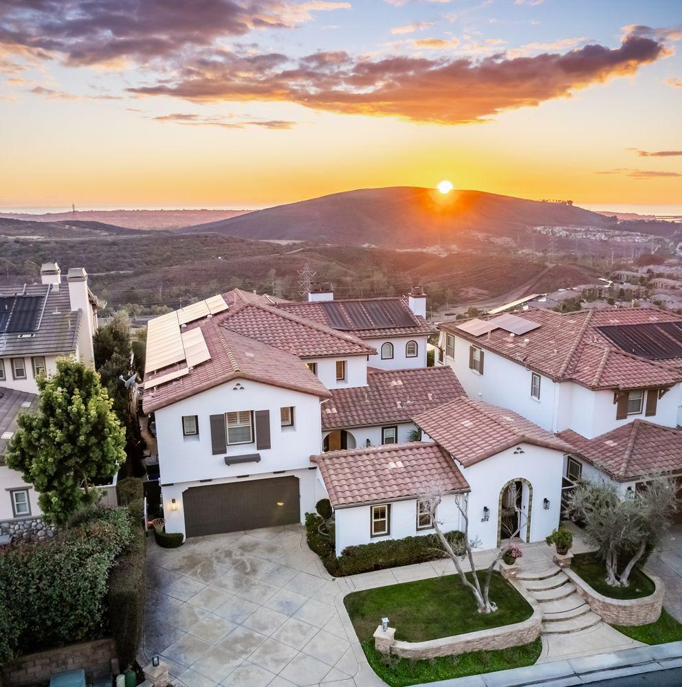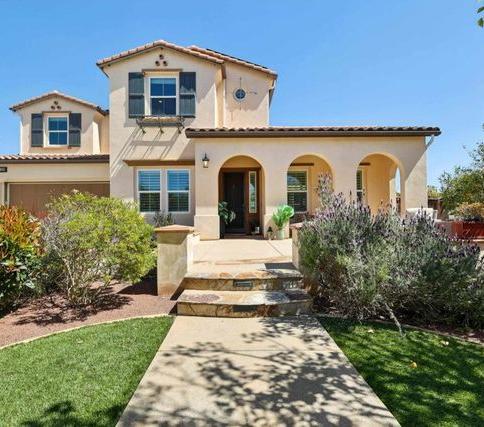 and upgraded bathrooms The primary suite boasts a view deck, spacious walk-in closet, and a luxurious upgraded bath with glass shower and soaking tub There are three additional bedrooms upstairs and two additional bathrooms (one Jack-N-Jill) as well as an upstairs laundry room Nestled near the end of the cul-de-sac, the property showcases beautiful curb appeal with professional landscaping, olive trees, and a unique entry leading to a tranquil courtyard with a fountain. The interior is appointed with OWNED SOLAR, plantation shutters, custom paint, dramatic high ceilings, an elegant wrought iron banister and A/C. Located in the desirable gated Azure community of San Elijo Hills, steps from top-rated schools and Questhaven park, this property offers luxury living with unparalleled views and amenities.Enjoy all that San Elijo Hills has to offer with 18 miles of trails and unique town center with restaurants, shopping and more! Professional photos coming soon.