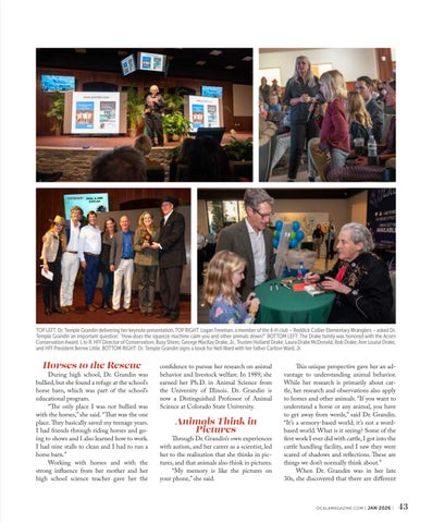This unique perspective gave her an advantage to understanding animal behavior. While her research is primarily about cattle, her research and observations also apply to horses and other animals. “If you want to understand a horse or any animal, you have to get away from words,” said Dr. Grandin. “It’s a sensory-based world; it’s not a wordbased world. What is it seeing? Some of the first work I ever did with cattle, I got into the cattle handling facility, and I saw they were scared of shadows and reflections. These are things we don’t normally think about.” When Dr. Grandin was in her late 30s, she discovered that there are different