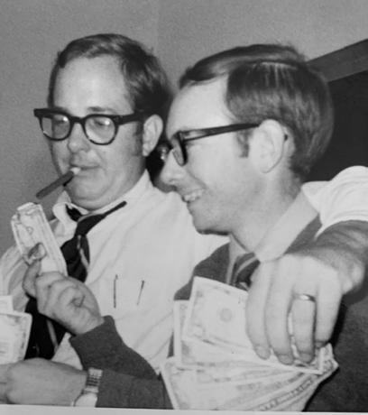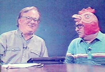 Buddy with fellow editor Ron Caylor of Today in Cocoa after a good night at the track on the set of his Denver TV talk show in the 1980s with partner Joe Williams wearing a chicken suit after losing a football bet