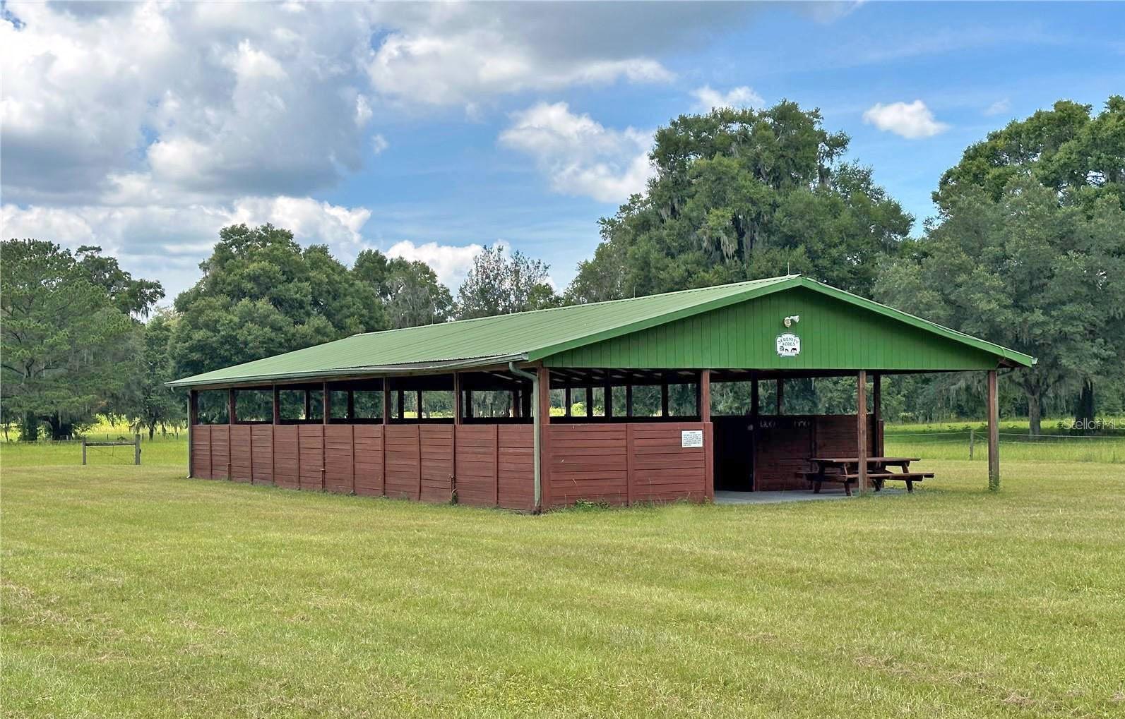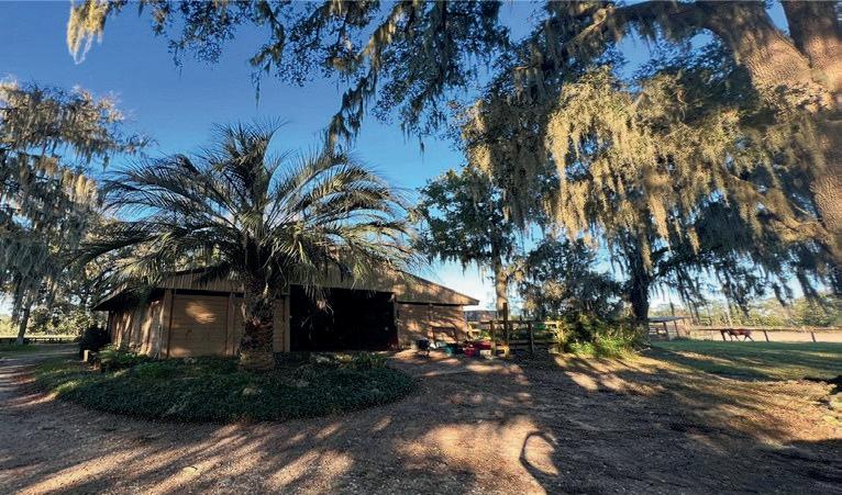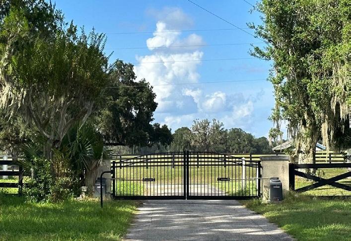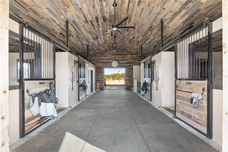 The separate gated entrance off 318 leads to a 24-stall barn with apartment, a covered Eurociser & a swimming pond for horses that is perfect for layups or conditioning your horses, RV hookups, and lush green paddocks with automatic waters.