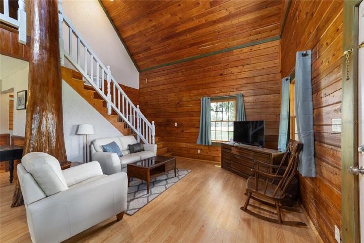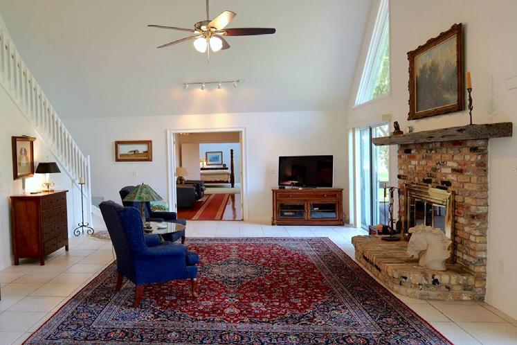 Cathedral beamed ceilings with two magnificent fireplaces and an incredible view.