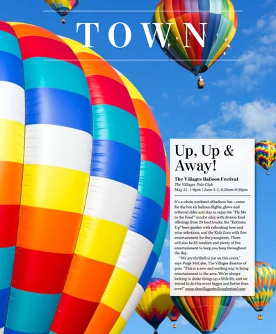 TOWN Up, Up & Away! The Villages Balloon Festival The Villages Polo Club May 31, 1-9pm | June 1-2, 6:30am-9:30pm It’s a whole weekend of balloon fun—come for the hot air balloon flights, glows and tethered rides and stay to enjoy the “Fly Me to the Food” vendor alley with diverse food offerings from 20 food trucks, the “Bottoms Up” beer garden with refreshing beer and wine selections, and the Kids Zone with free entertainment for the youngsters. There will also be 85 vendors and plenty of live entertainment to keep you busy throughout the day. “We are thrilled to put on this event,” says Paige McCabe, The Villages director of polo. “This is a new and exciting way to bring entertainment to the area. We’re always looking to shake things up a little bit, and we intend to do this event bigger and better than ever!” www.thevillagesballoonfestival.com